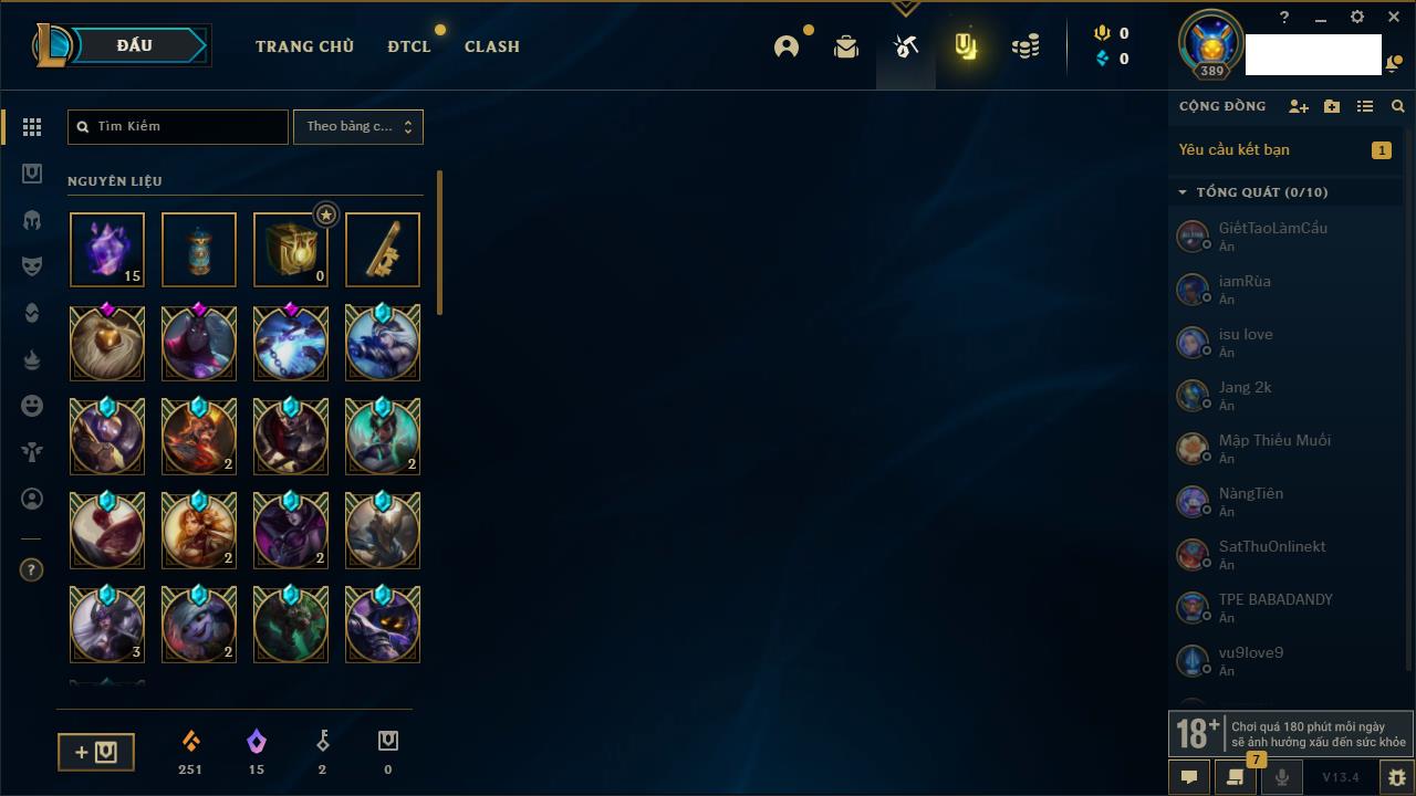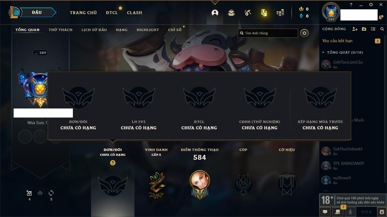 Rank Đơn: Đồng IIKhung: Chưa có khungTướng: 170 - Còn 56487 THXTrang Phục: 90Rank ĐTCL: Chưa RankLinh Thú: 129