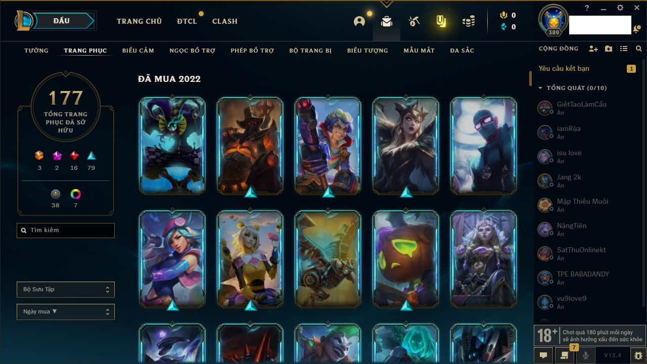 Rank Đơn: Vàng IIIKhung: VàngTướng: 170 - Còn 33222 THXTrang Phục: 136Rank ĐTCL: Chưa RankLinh Thú: 40