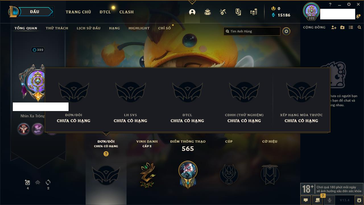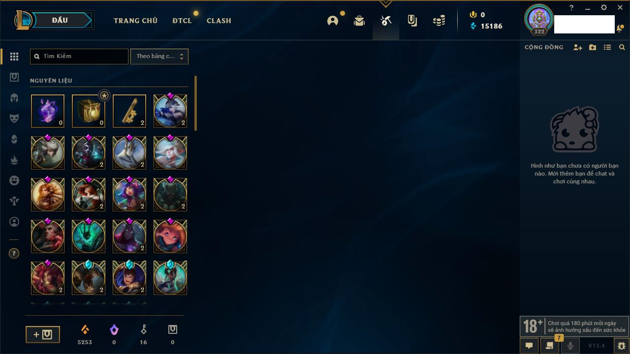 Rank Đơn: Đồng IIKhung: Chưa có khungTướng: 170 - Còn 56487 THXTrang Phục: 90Rank ĐTCL: Chưa RankLinh Thú: 129