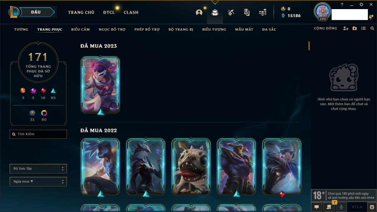 Rank Đơn: Chưa RankKhung: Chưa có khungTướng: 157 - Còn 6783 THXTrang Phục: 50Rank ĐTCL: Chưa RankLinh Thú: 37