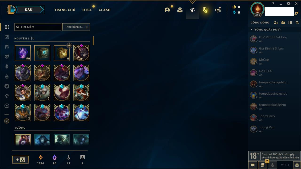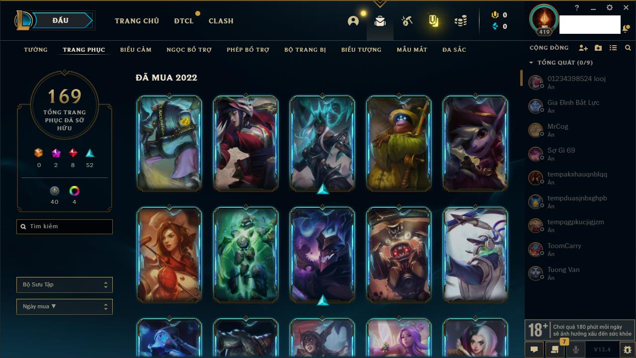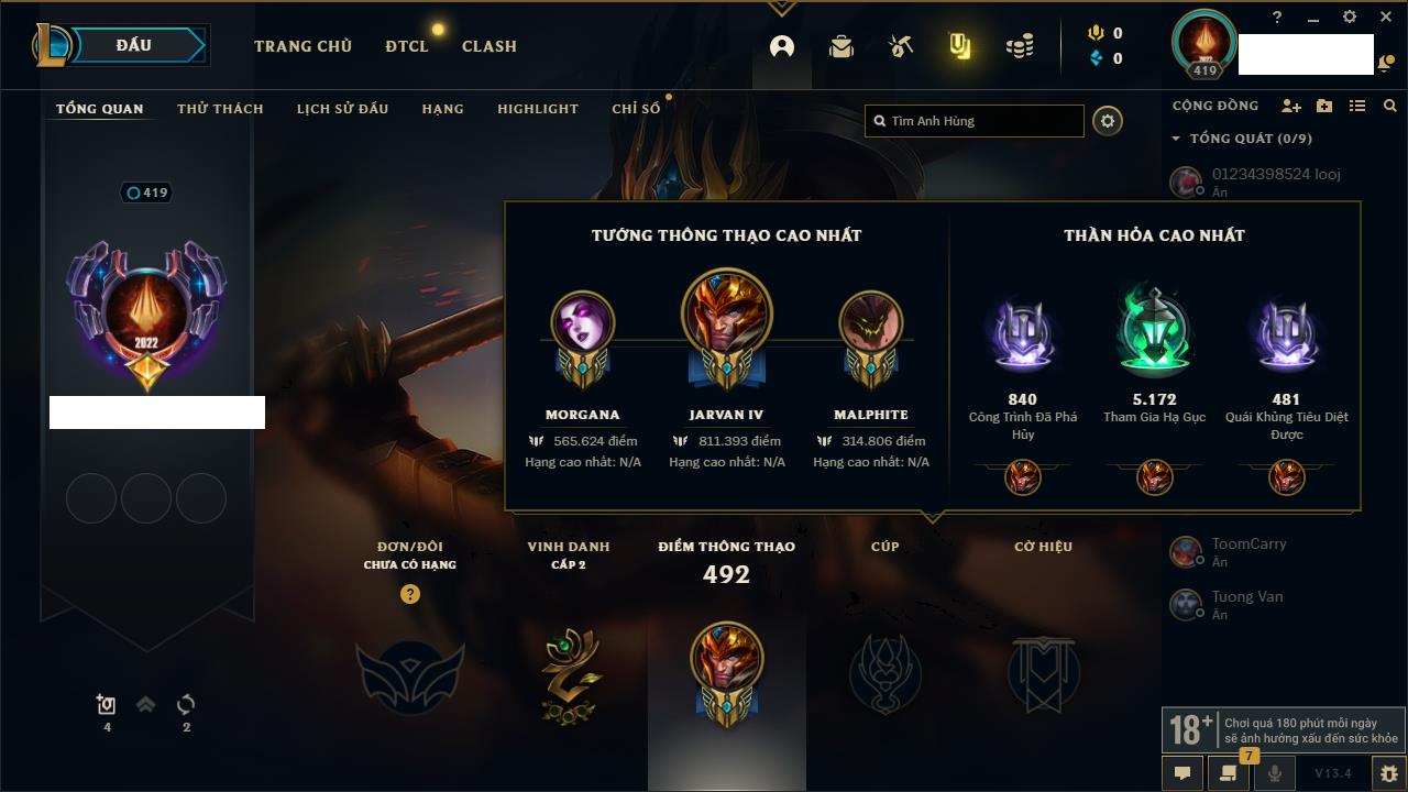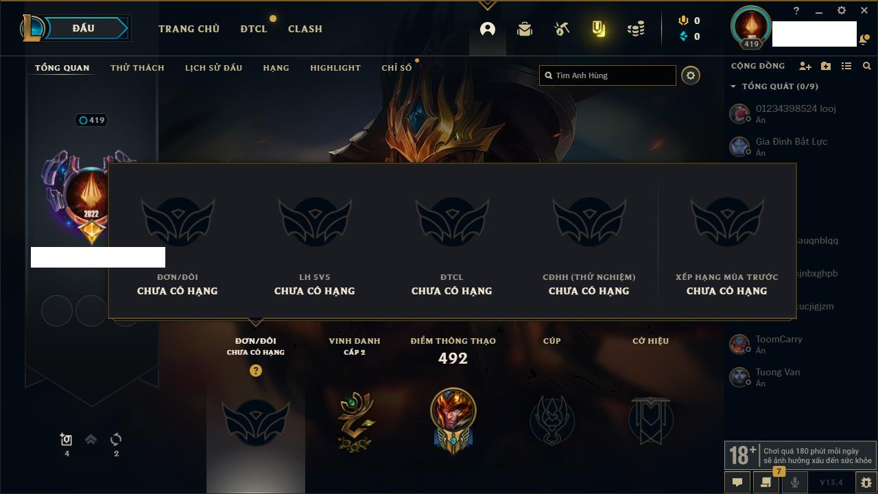 Rank Đơn: Bạch Kim IV Khung: Chưa có khung Tướng: 172 - Còn 29488 THX Trang Phục: 120 Rank ĐTCL: Bạc III Linh Thú: 50