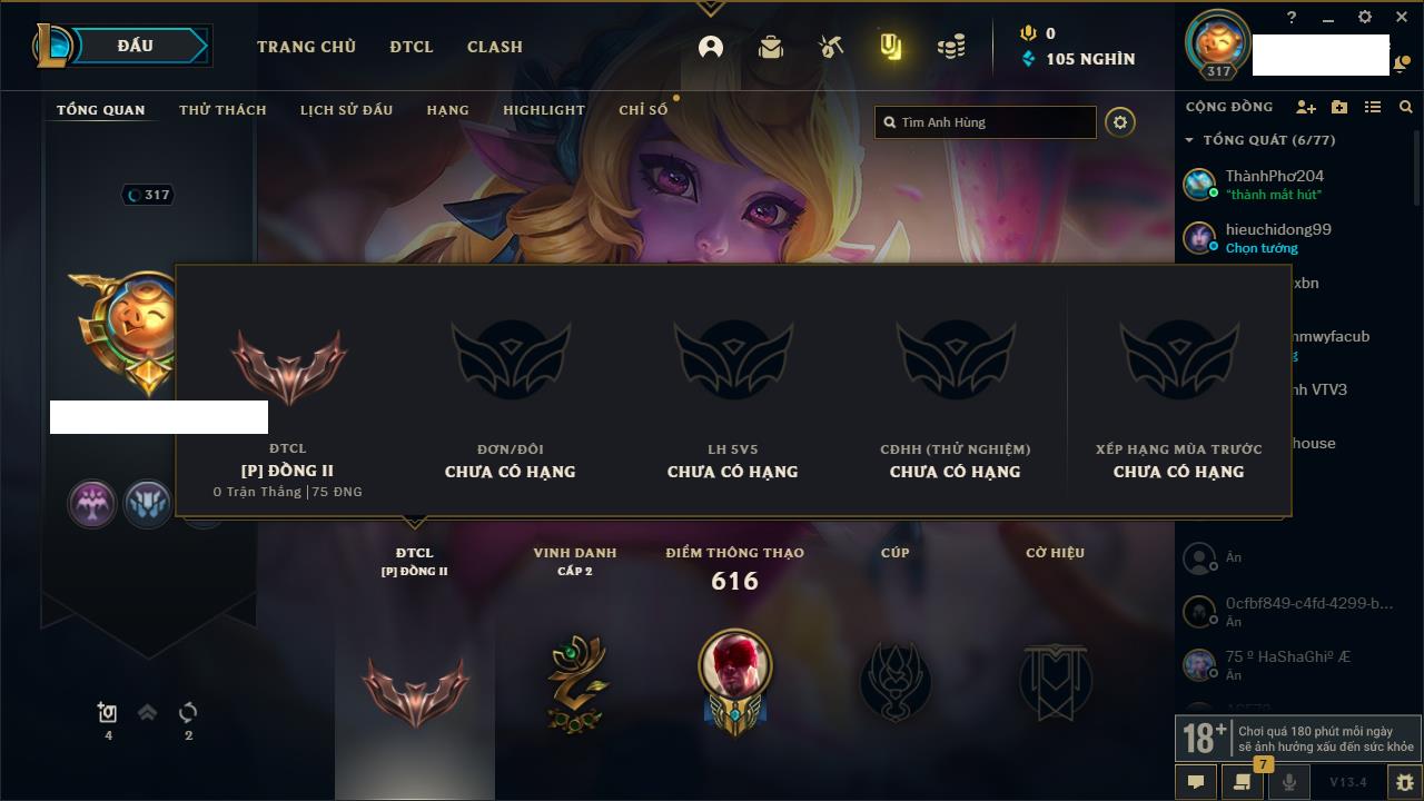 Rank Đơn: Bạc IV Khung: Bạc Tướng: 64 - Còn 5901 THX Trang Phục: 17 Rank ĐTCL: Chưa Rank Linh Thú: 105