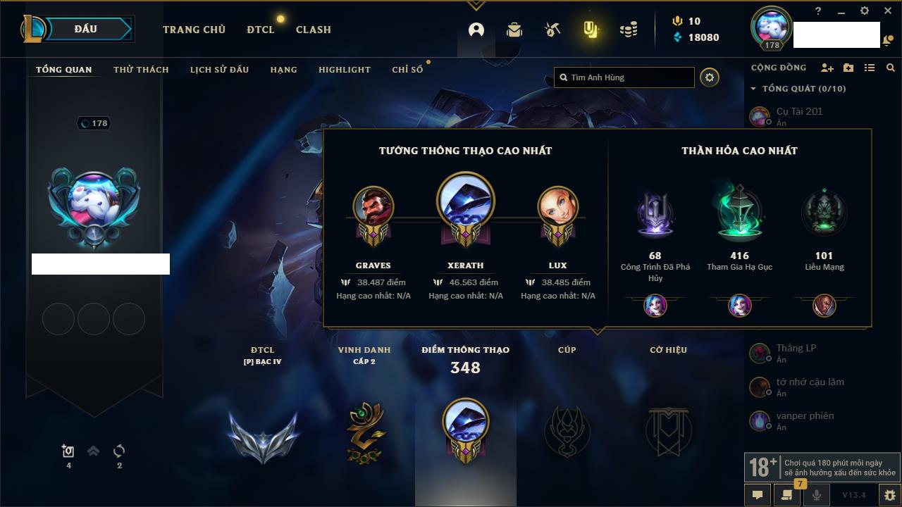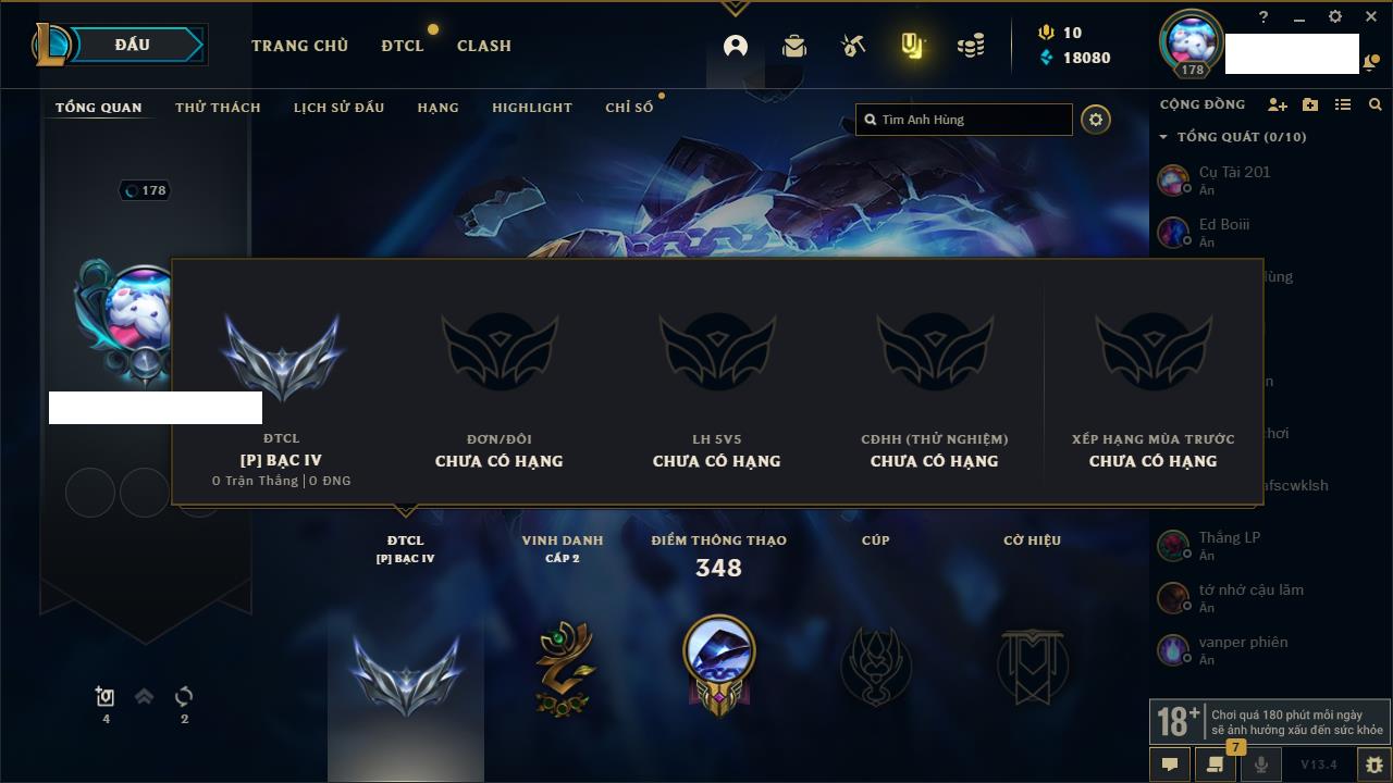 Rank Đơn: Chưa RankKhung: BạcTướng: 141 - Còn 299 THXTrang Phục: 101Rank ĐTCL: Chưa RankLinh Thú: 84