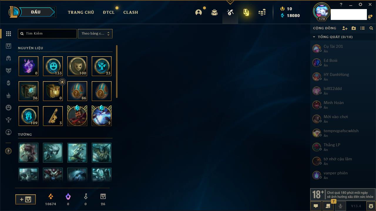 Rank Đơn: Chưa RankKhung: Chưa có khungTướng: 163 - Còn 157403 THXTrang Phục: 149Rank ĐTCL: Chưa RankLinh Thú: 122