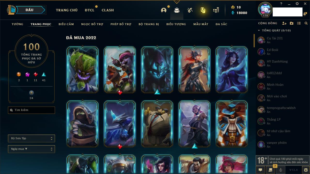 Rank Đơn: Chưa RankKhung: Chưa có khungTướng: 162 - Còn 23234 THXTrang Phục: 150Rank ĐTCL: Chưa RankLinh Thú: 42