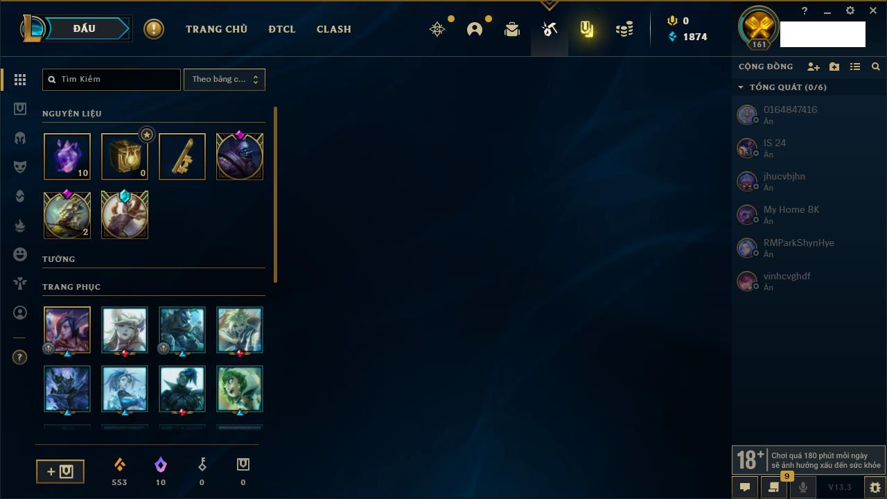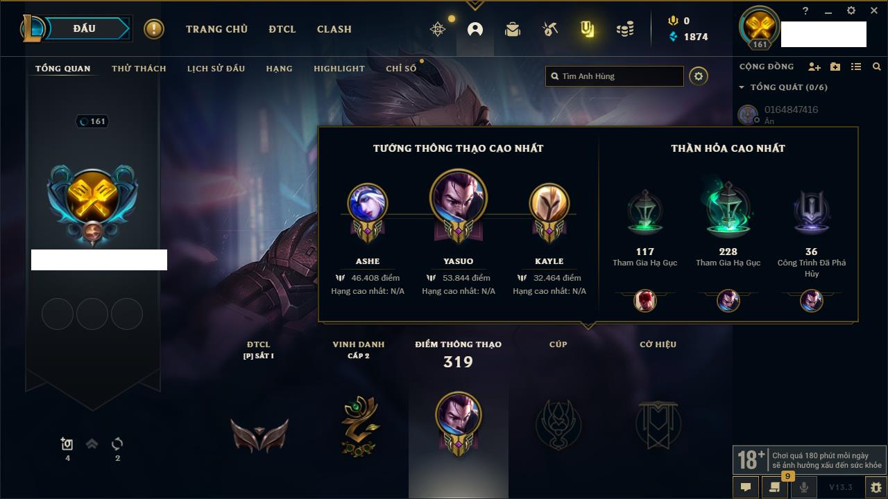 Rank Đơn: Chưa rank mùa nàoKhung: Chưa có khungTướng: 3 - Còn 34550 THXTrang Phục: 0Rank ĐTCL: Bạch Kim IVLinh Thú: 41