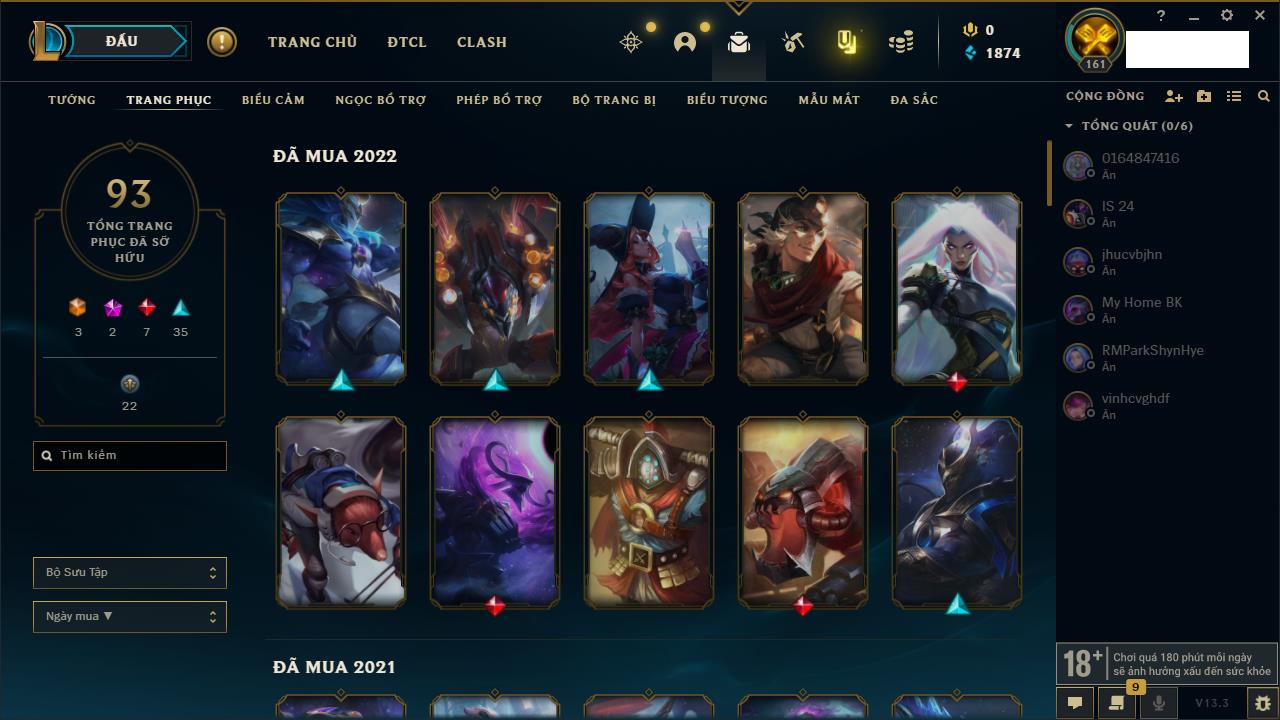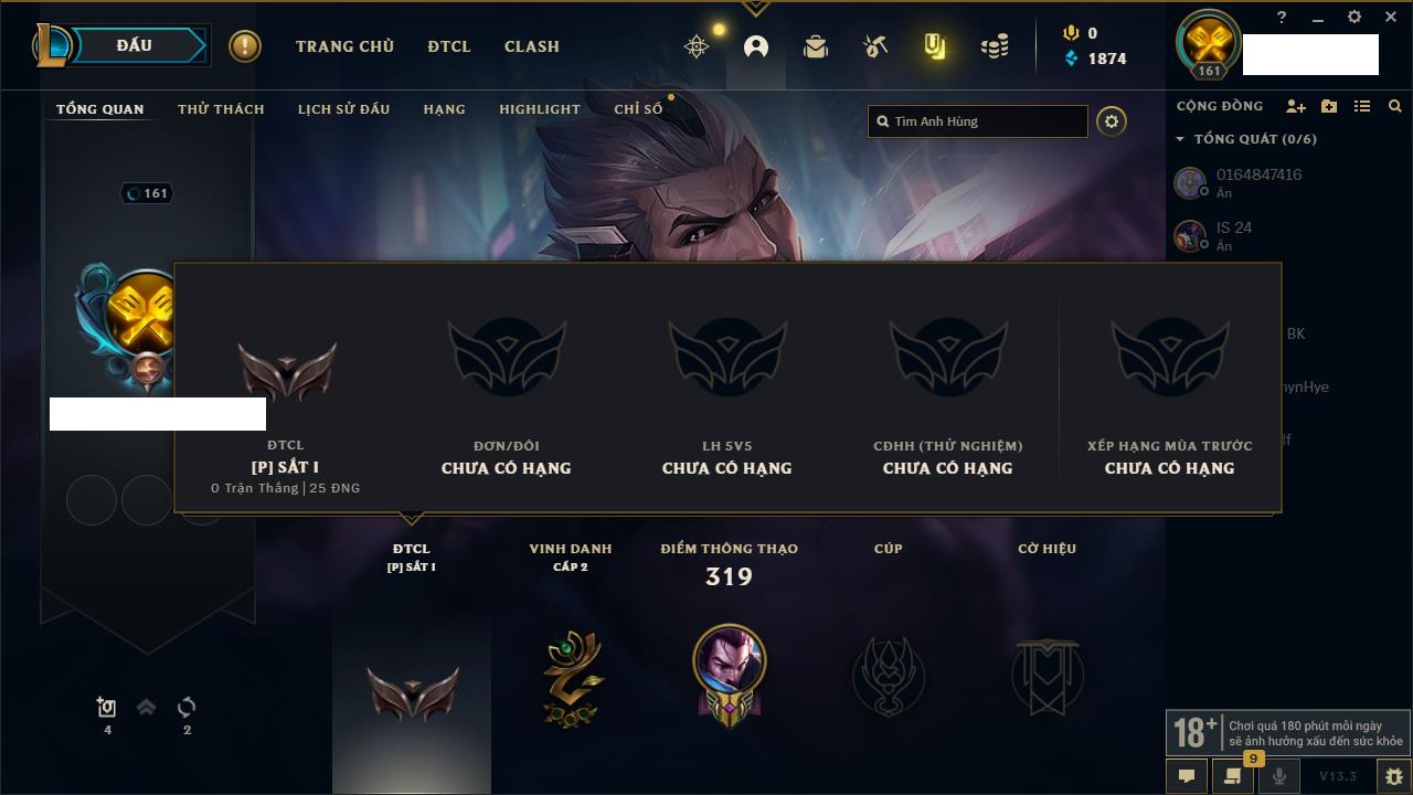 Rank Đơn: Chưa rank mùa nàoKhung: Chưa có khungTướng: 3 - Còn 32650 THXTrang Phục: 0Rank ĐTCL: Bạch Kim IVLinh Thú: 66