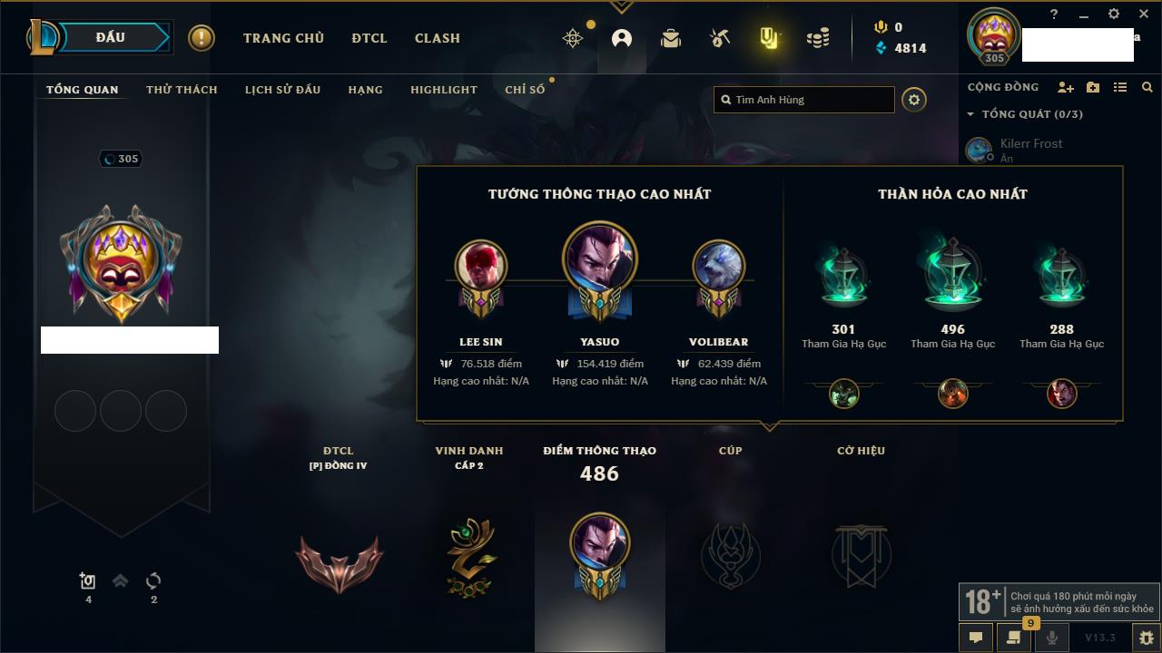 Rank Đơn: Chưa RankKhung: Chưa có khungTướng: 154 - Còn 18477 THXTrang Phục: 127Rank ĐTCL: Vàng ILinh Thú: 183