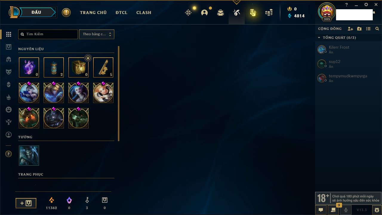 Rank Đơn: Chưa RankKhung: Chưa có khungTướng: 162 - Còn 23234 THXTrang Phục: 150Rank ĐTCL: Chưa RankLinh Thú: 42