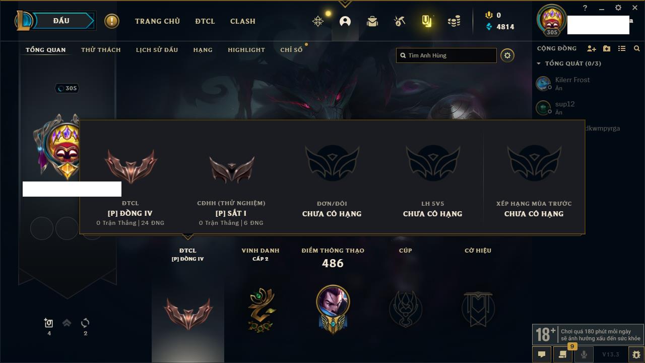 Rank Đơn: Sắt IKhung: SắtTướng: 38 - Còn 731 THXTrang Phục: 8Rank ĐTCL: Chưa RankLinh Thú: 72