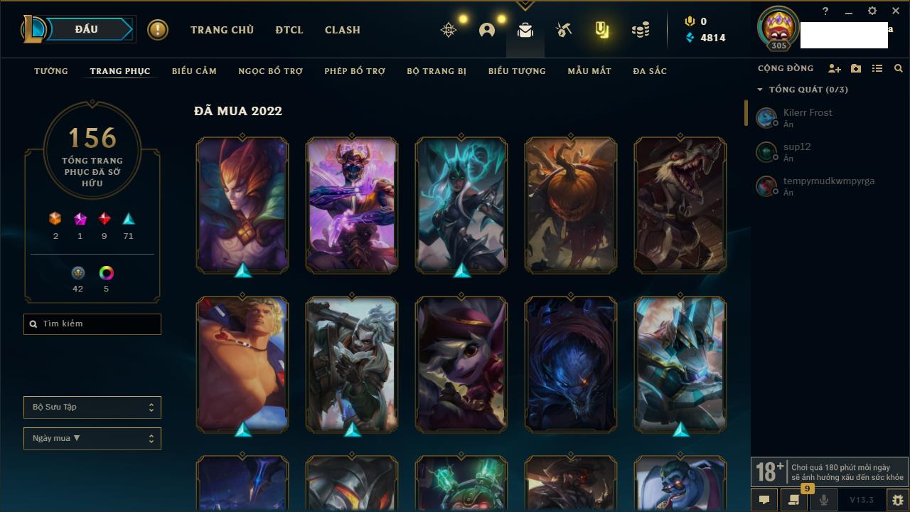 Rank Đơn: Chưa RankKhung: Chưa có khungTướng: 163 - Còn 157403 THXTrang Phục: 149Rank ĐTCL: Chưa RankLinh Thú: 122