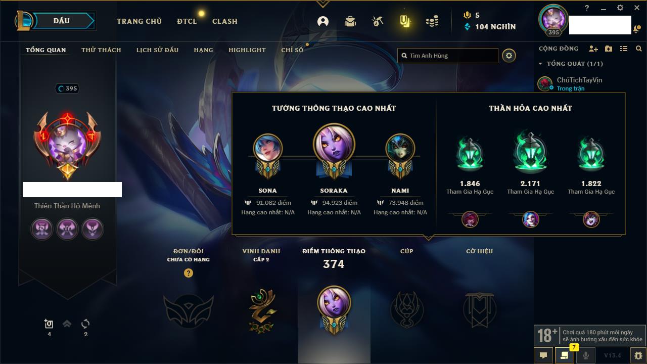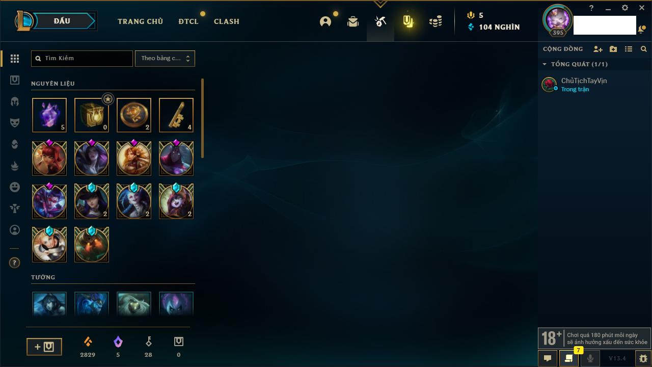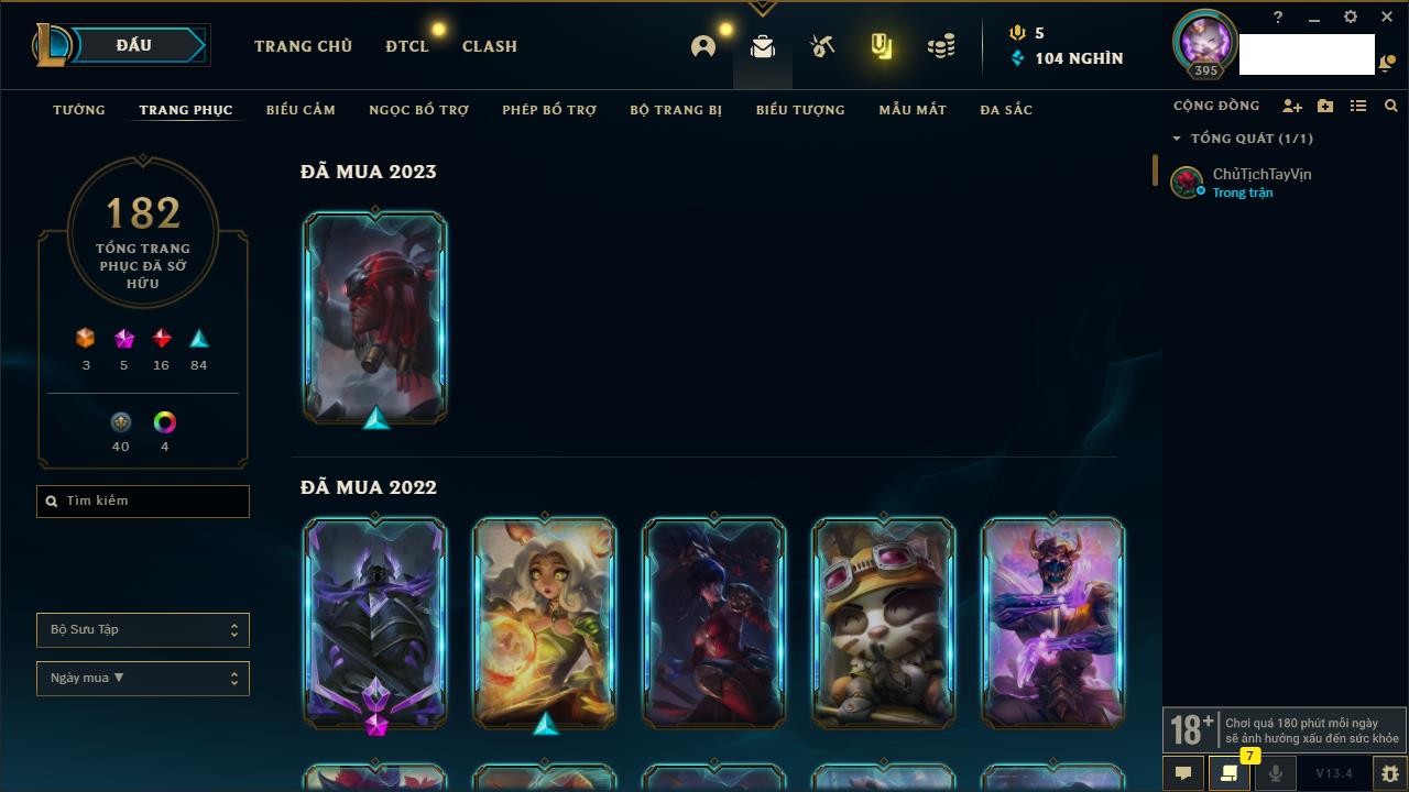 Rank Đơn: Bạc IVKhung: BạcTướng: 171 - Còn 102637 THXTrang Phục: 169Rank ĐTCL: Vàng IILinh Thú: 127