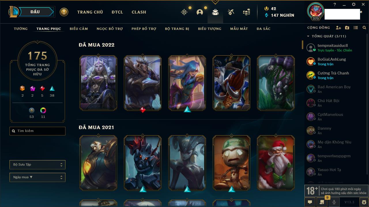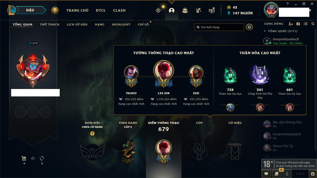 Rank Đơn: Đồng IKhung: ĐồngTướng: 168 - Còn 11447 THXTrang Phục: 245Rank ĐTCL: Chưa RankLinh Thú: 53
