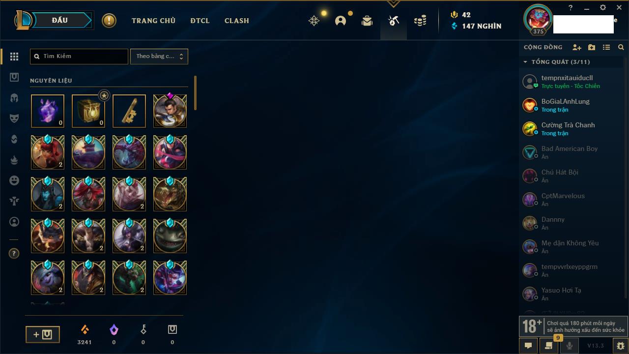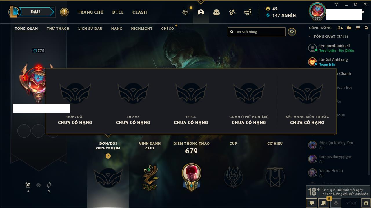 Rank Đơn: Vàng IIIKhung: BạcTướng: 171 - Còn 101359 THXTrang Phục: 88Rank ĐTCL: Kim Cương IVLinh Thú: 200
