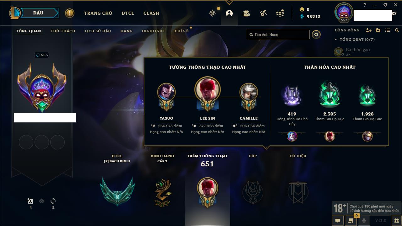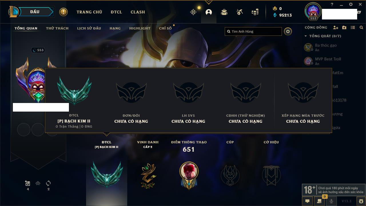 Rank Đơn: Bạch Kim IIIKhung: Bạch kimTướng: 171 - Còn 210697 THXTrang Phục: 220Rank ĐTCL: Bạc IVLinh Thú: 51