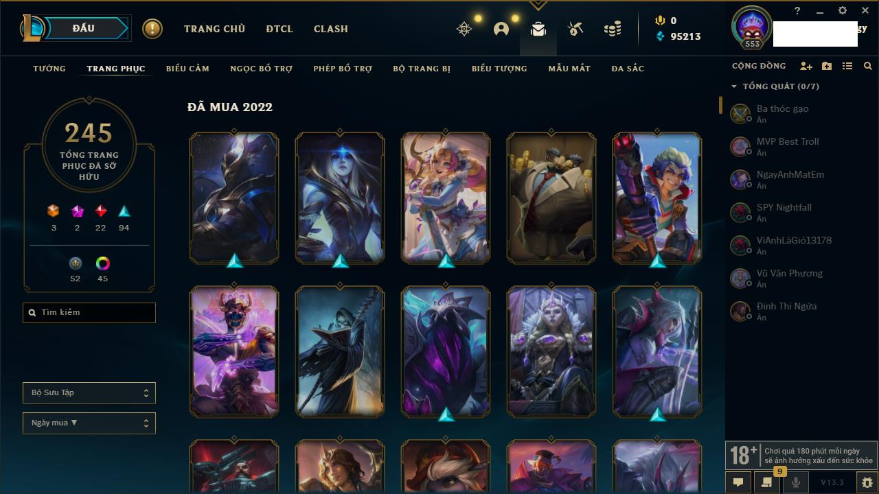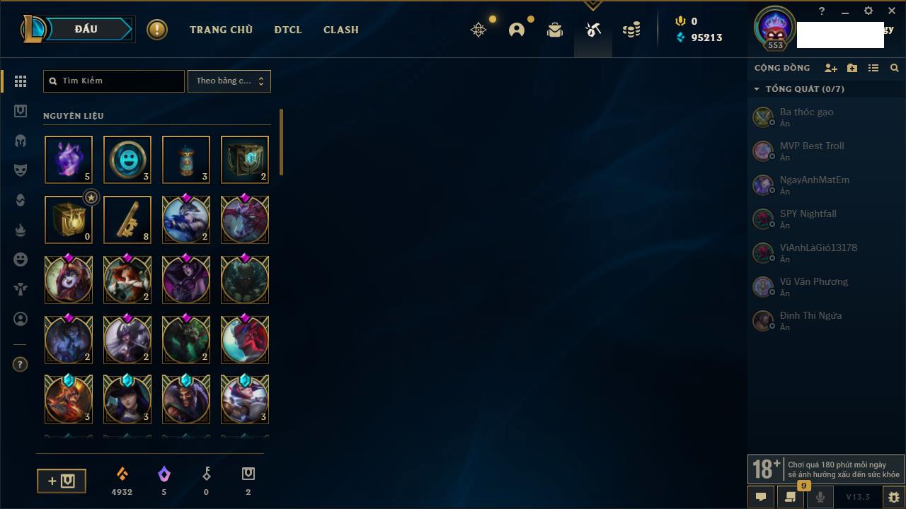 Rank Đơn: Bạch Kim IVKhung: Bạch kimTướng: 171 - Còn 218930 THXTrang Phục: 162Rank ĐTCL: Chưa RankLinh Thú: 118