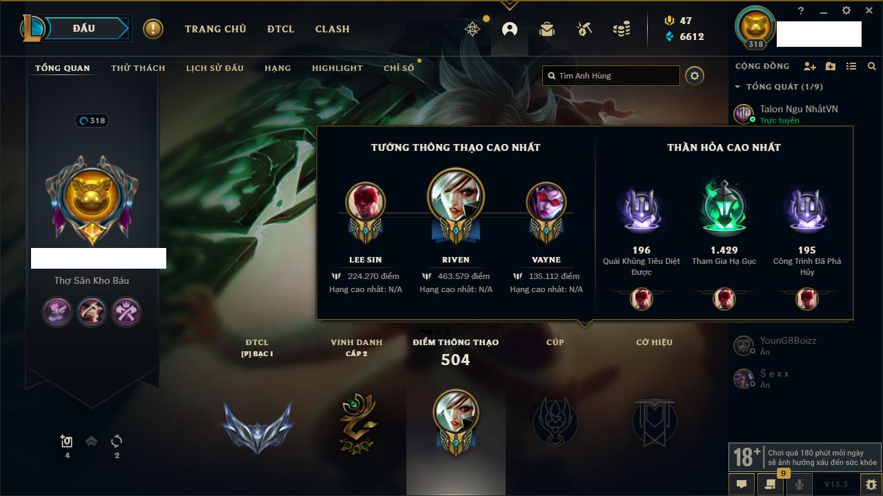 Rank Đơn: Vàng IKhung: Bạch kimTướng: 170 - Còn 212450 THXTrang Phục: 214Rank ĐTCL: Bạch Kim IVLinh Thú: 221