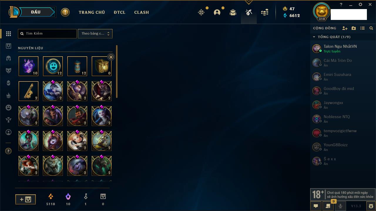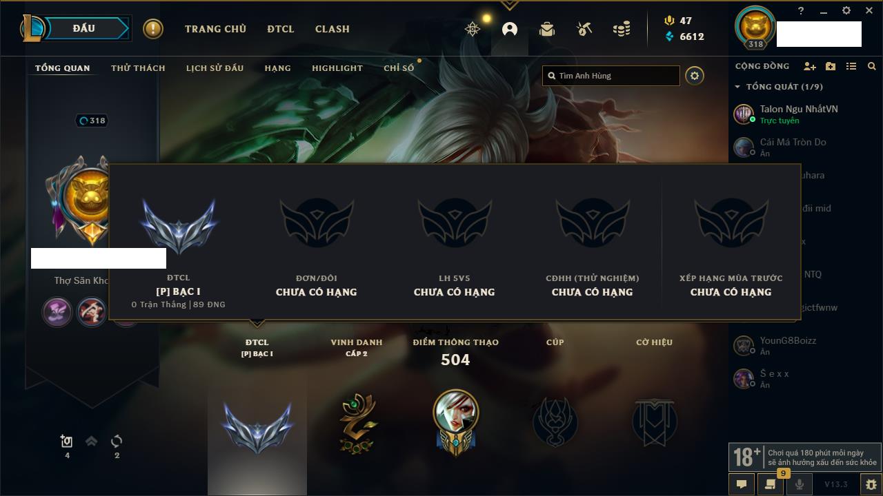 Rank Đơn: Bạch Kim IVKhung: Bạch kimTướng: 171 - Còn 182788 THXTrang Phục: 158Rank ĐTCL: Lục Bảo IVLinh Thú: 56