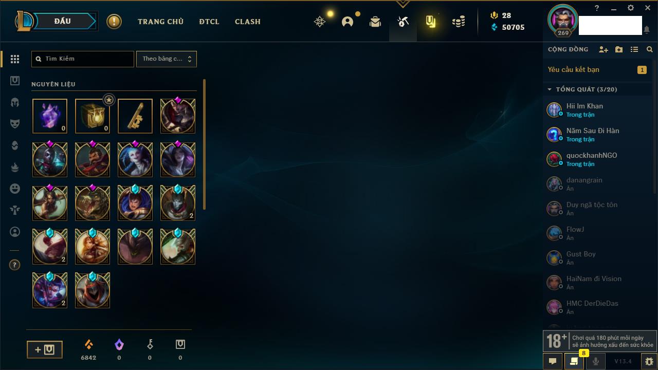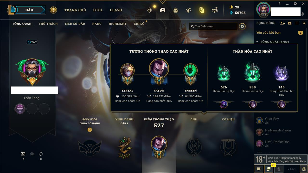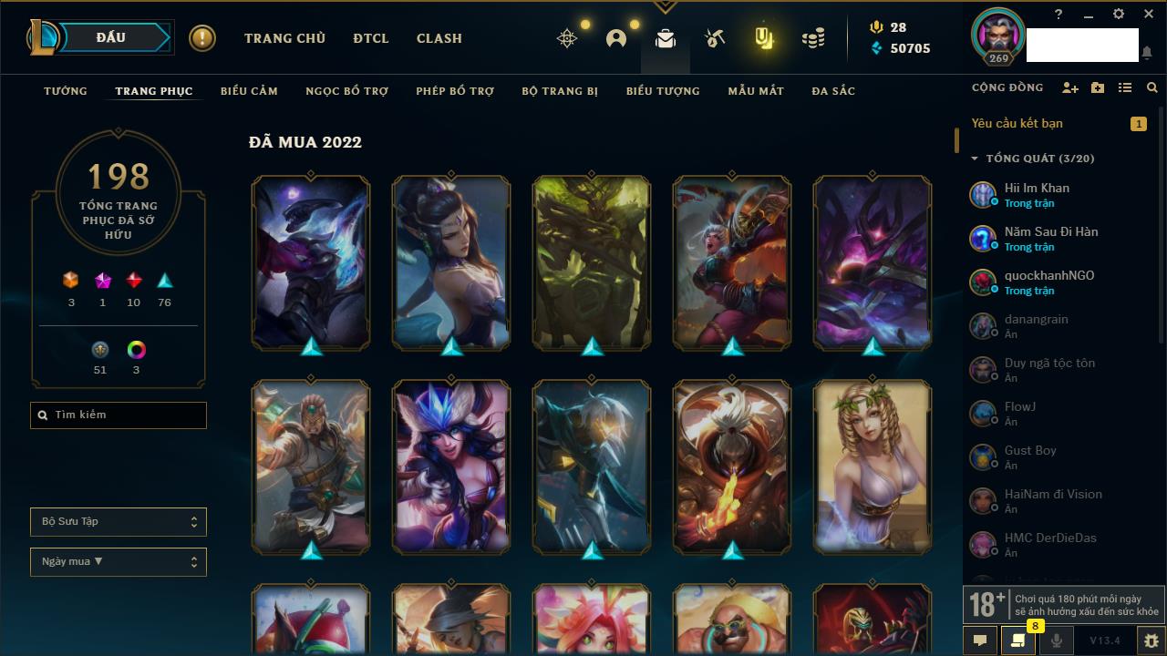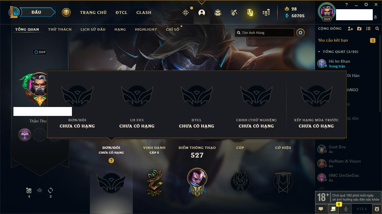 Rank Đơn: Đồng IIIKhung: Chưa có khungTướng: 152 - Còn 6423 THXTrang Phục: 160Rank ĐTCL: Chưa RankLinh Thú: 107