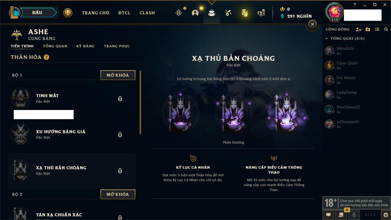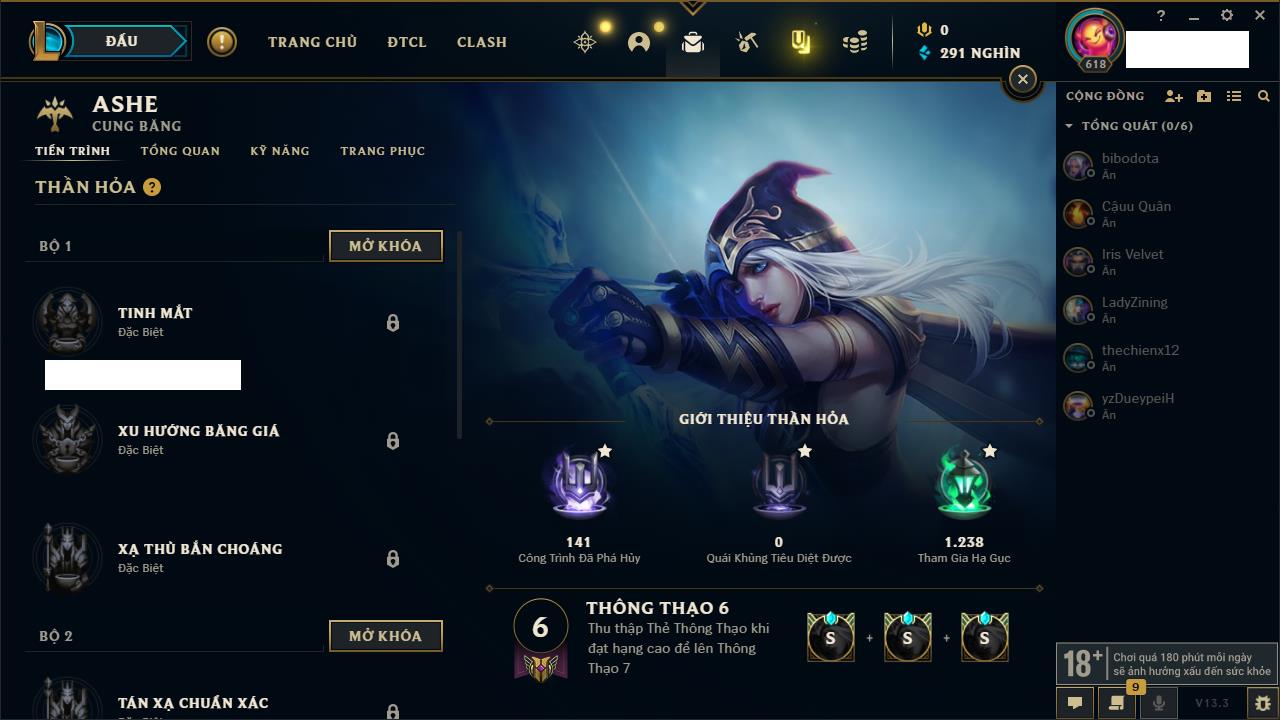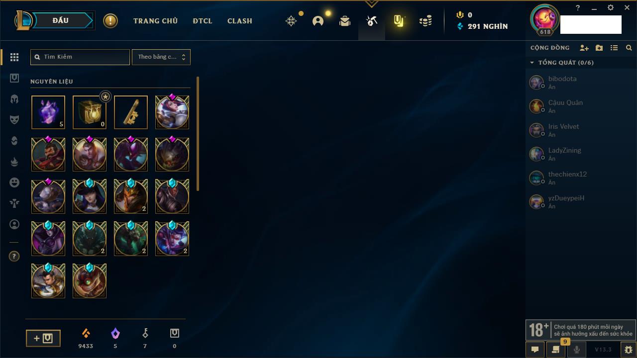 Rank Đơn: Vàng IKhung: BạcTướng: 171 - Còn 60584 THXTrang Phục: 286Rank ĐTCL: Vàng IIILinh Thú: 117