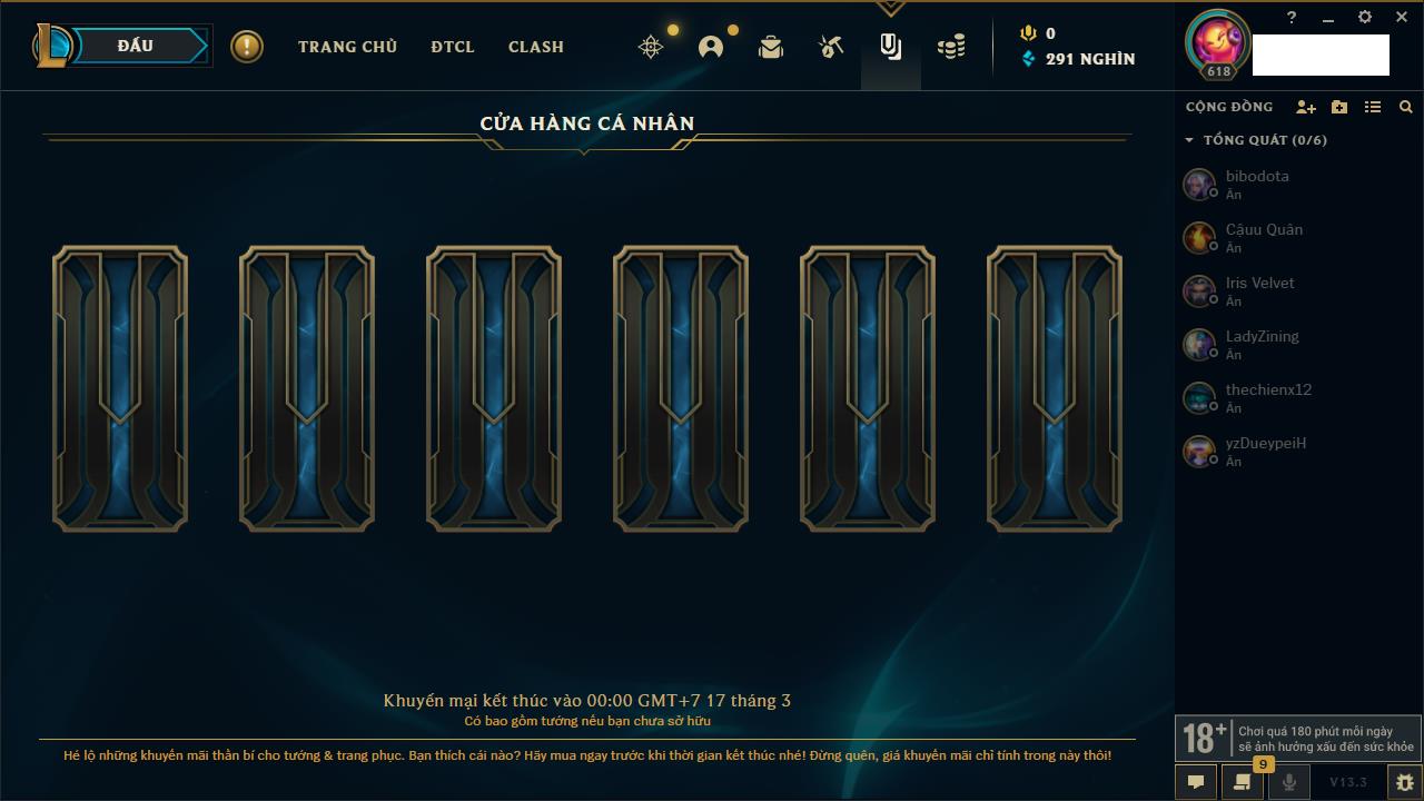 Rank Đơn: Vàng IVKhung: VàngTướng: 171 - Còn 660284 THXTrang Phục: 199Rank ĐTCL: Chưa RankLinh Thú: 34