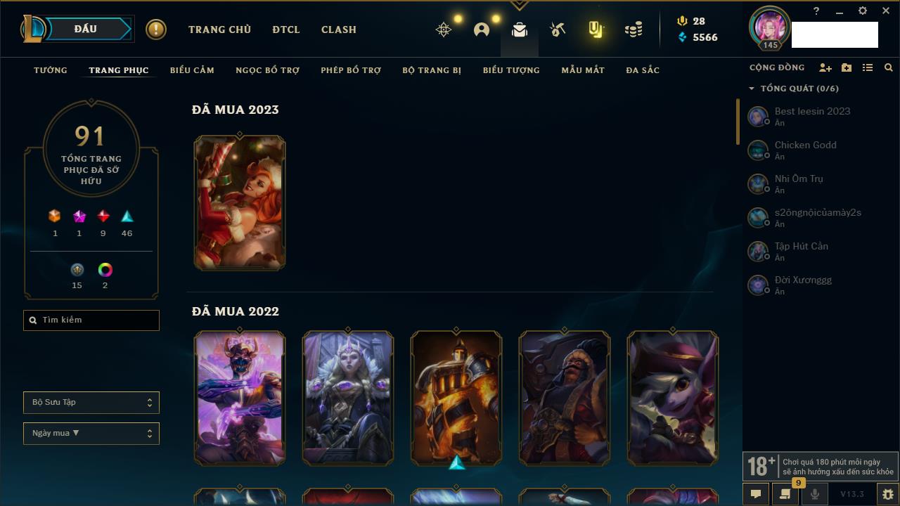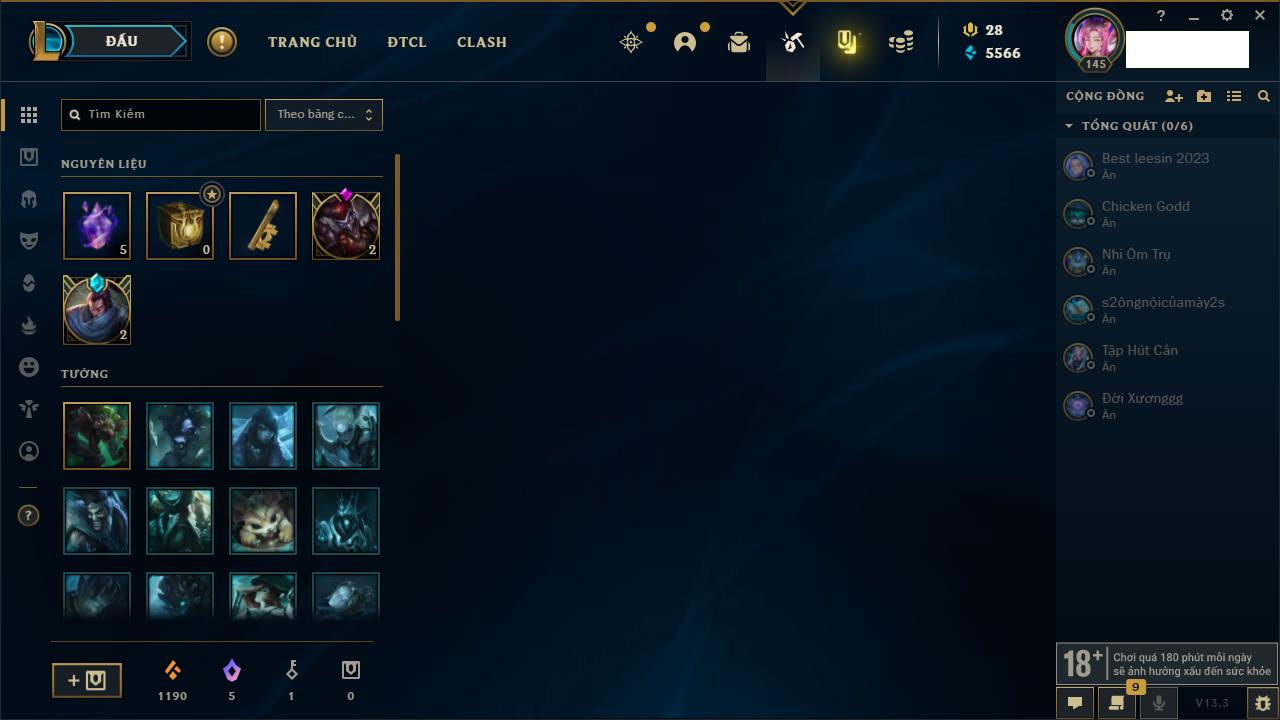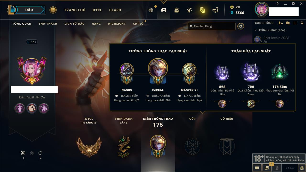 Rank Đơn: Chưa rank mùa nàoKhung: Chưa có khungTướng: 3 - Còn 34550 THXTrang Phục: 0Rank ĐTCL: Bạch Kim IVLinh Thú: 41