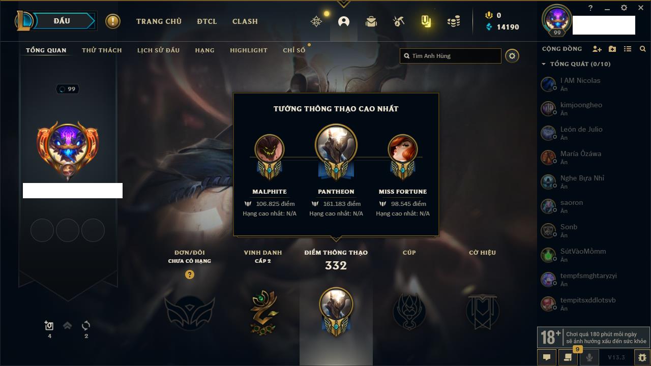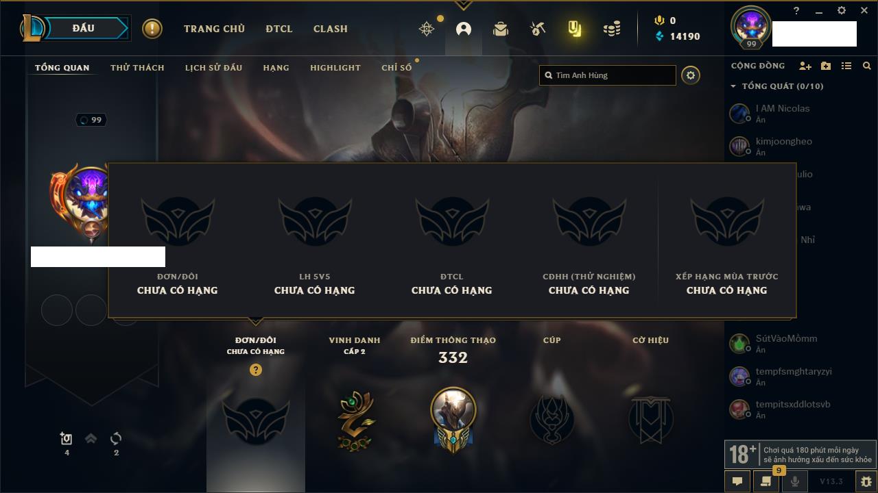 Rank Đơn: Sắt IKhung: SắtTướng: 171 - Còn 125789 THXTrang Phục: 151Rank ĐTCL: Đồng IIILinh Thú: 72