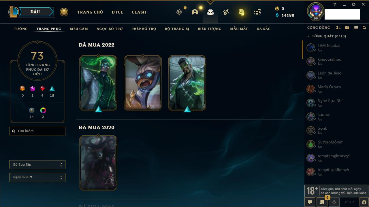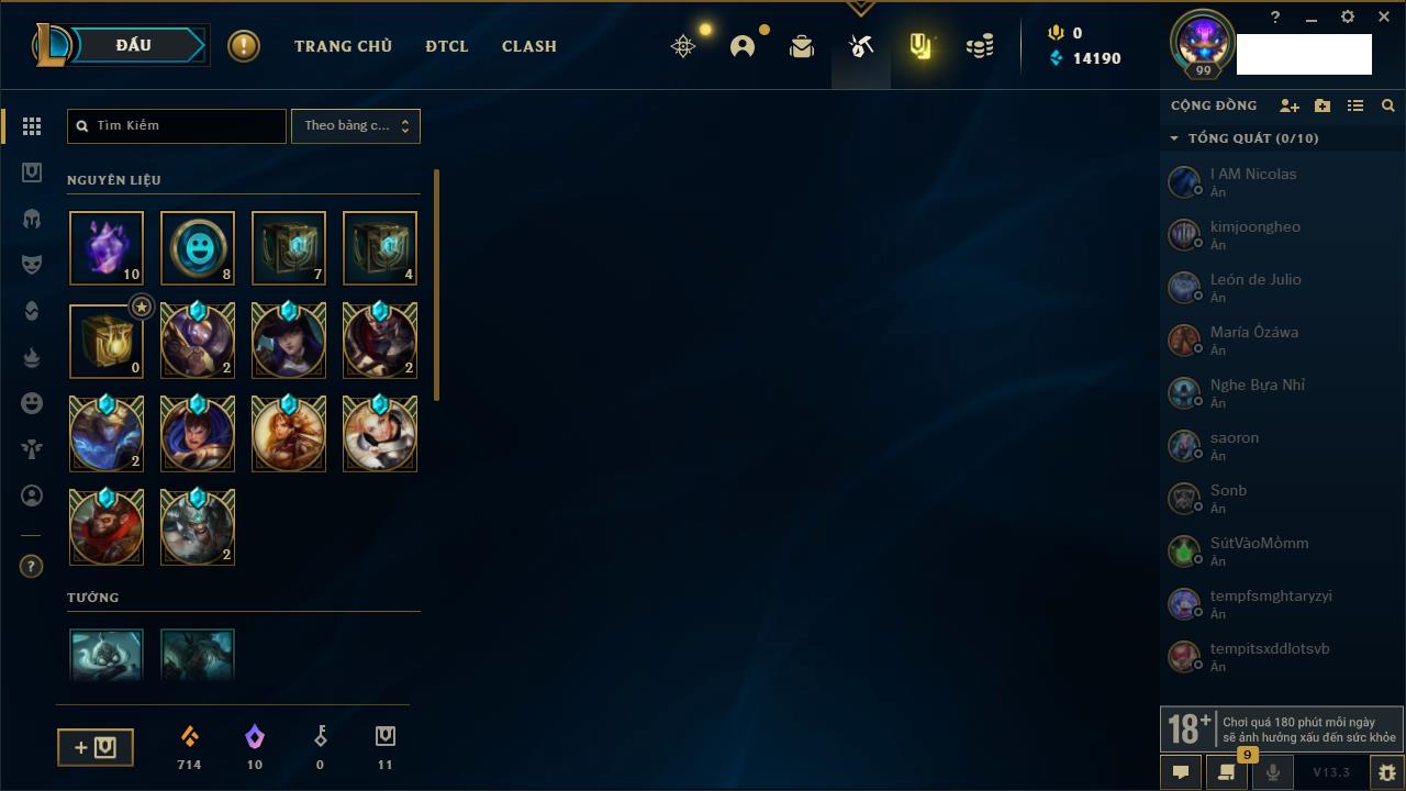 Rank Đơn: Bạc IVKhung: VàngTướng: 172 - Còn 358384 THXTrang Phục: 177Rank ĐTCL: Lục Bảo IILinh Thú: 211