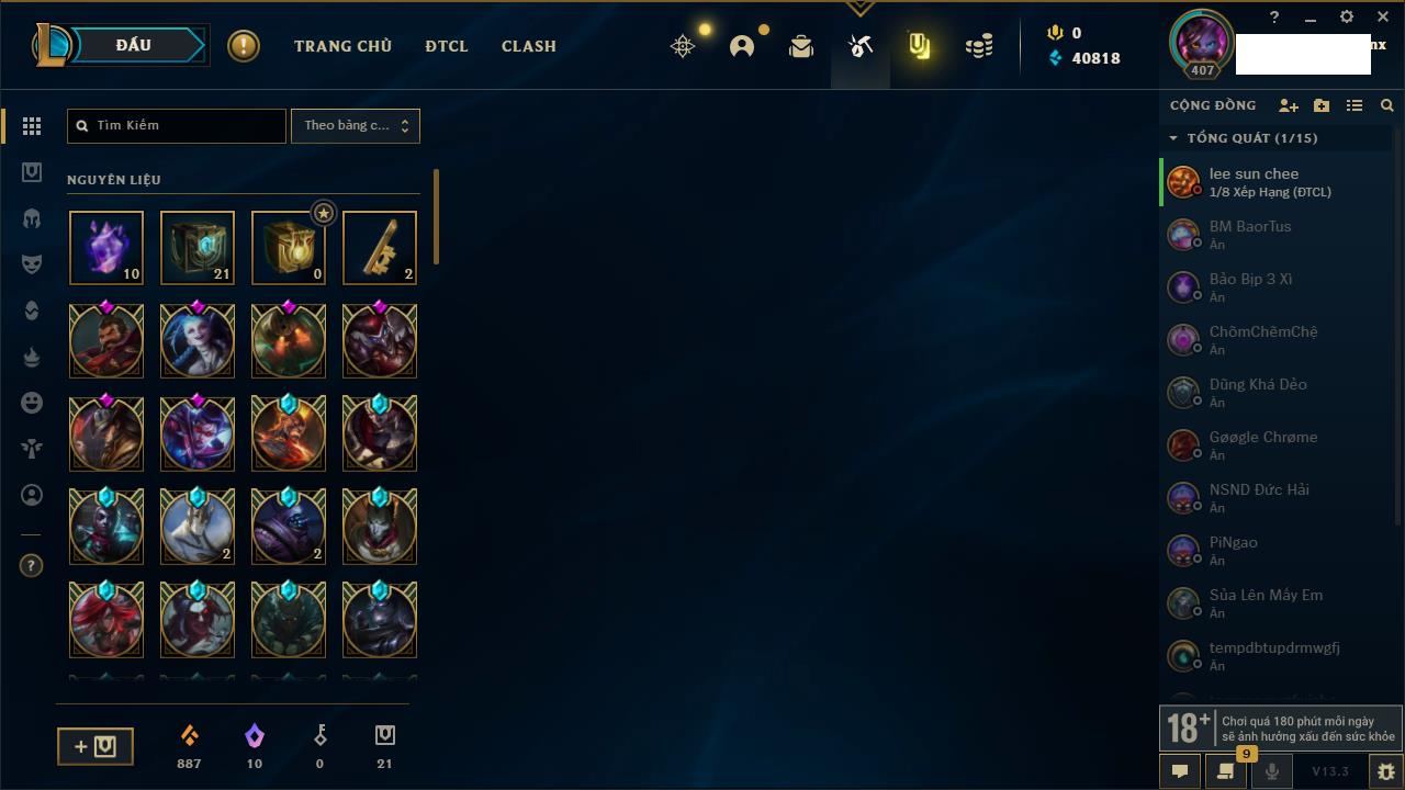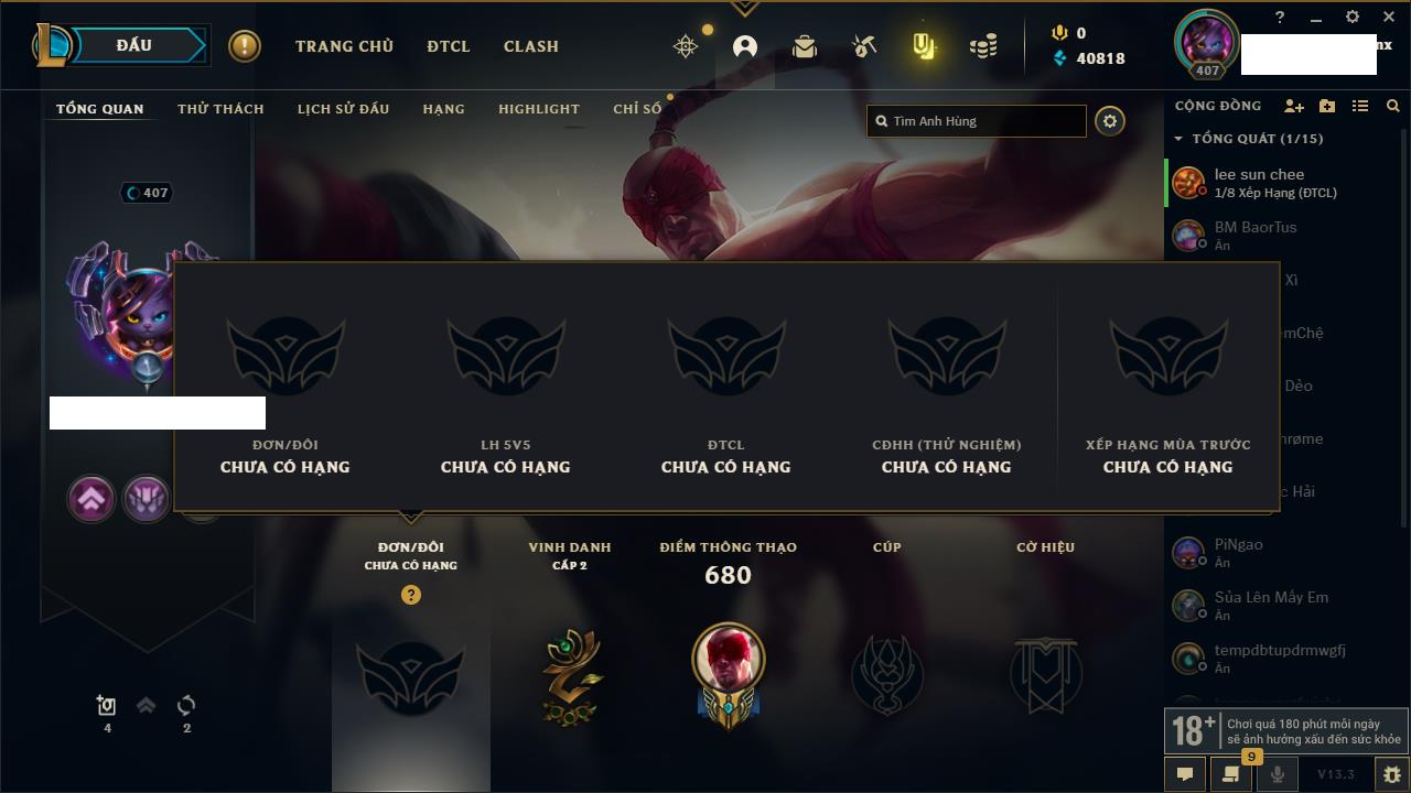 Rank Đơn: Chưa RankKhung: Chưa có khungTướng: 157 - Còn 6783 THXTrang Phục: 50Rank ĐTCL: Chưa RankLinh Thú: 37