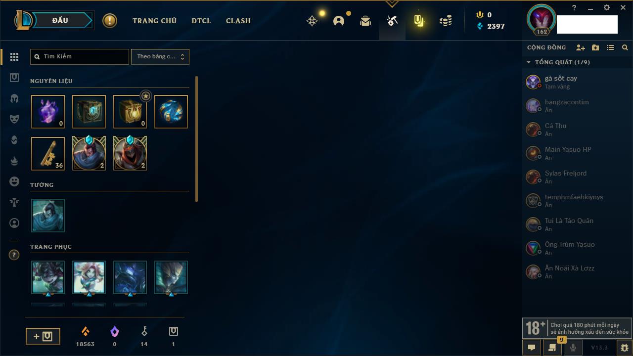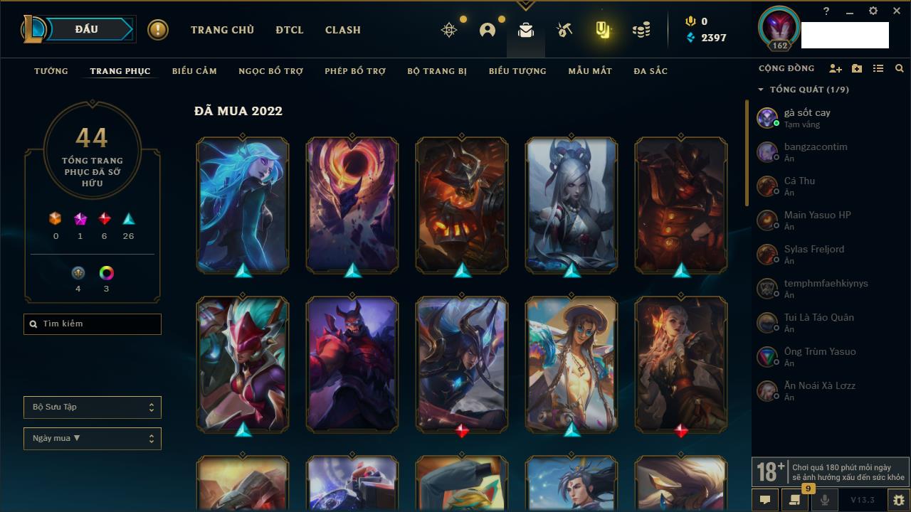 Rank Đơn: Đồng IIIKhung: Chưa có khungTướng: 86 - Còn 14367 THXTrang Phục: 19Rank ĐTCL: Vàng IIILinh Thú: 95