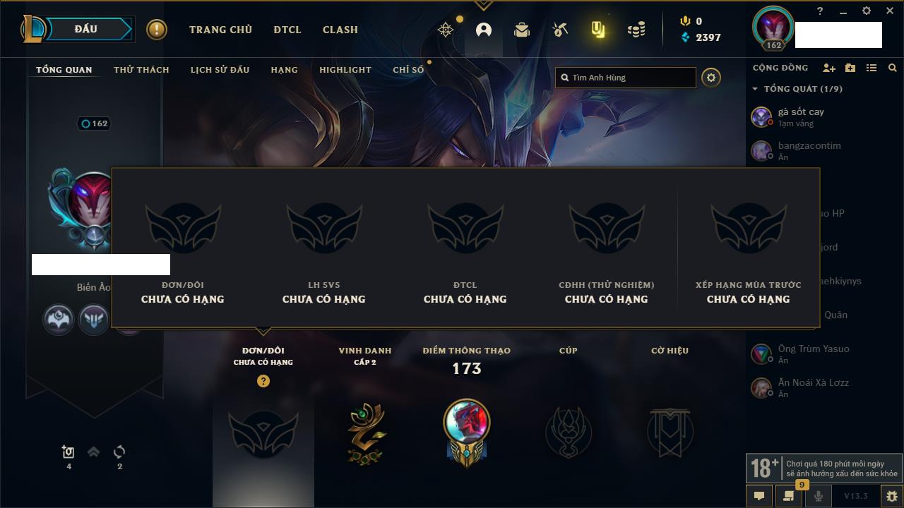 Rank Đơn: Sắt IIIKhung: Chưa có khungTướng: 77 - Còn 8133 THXTrang Phục: 11Rank ĐTCL: Bạch Kim IVLinh Thú: 108