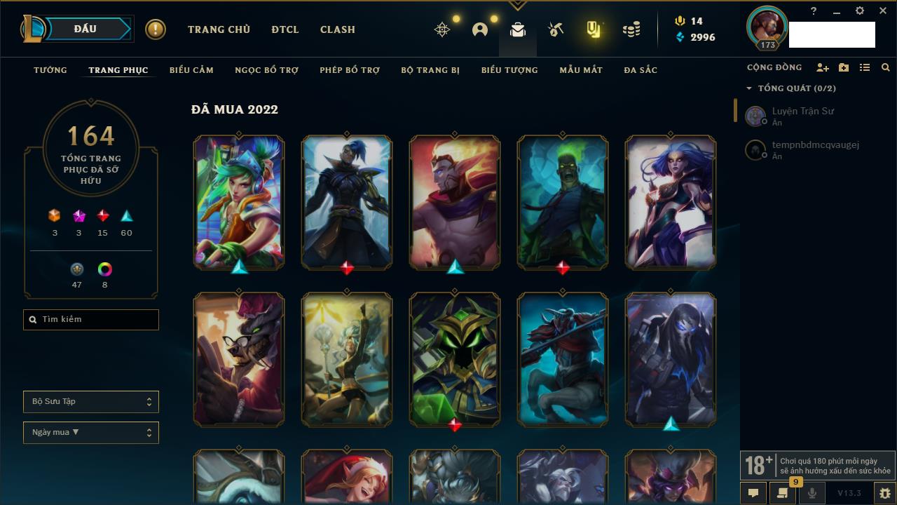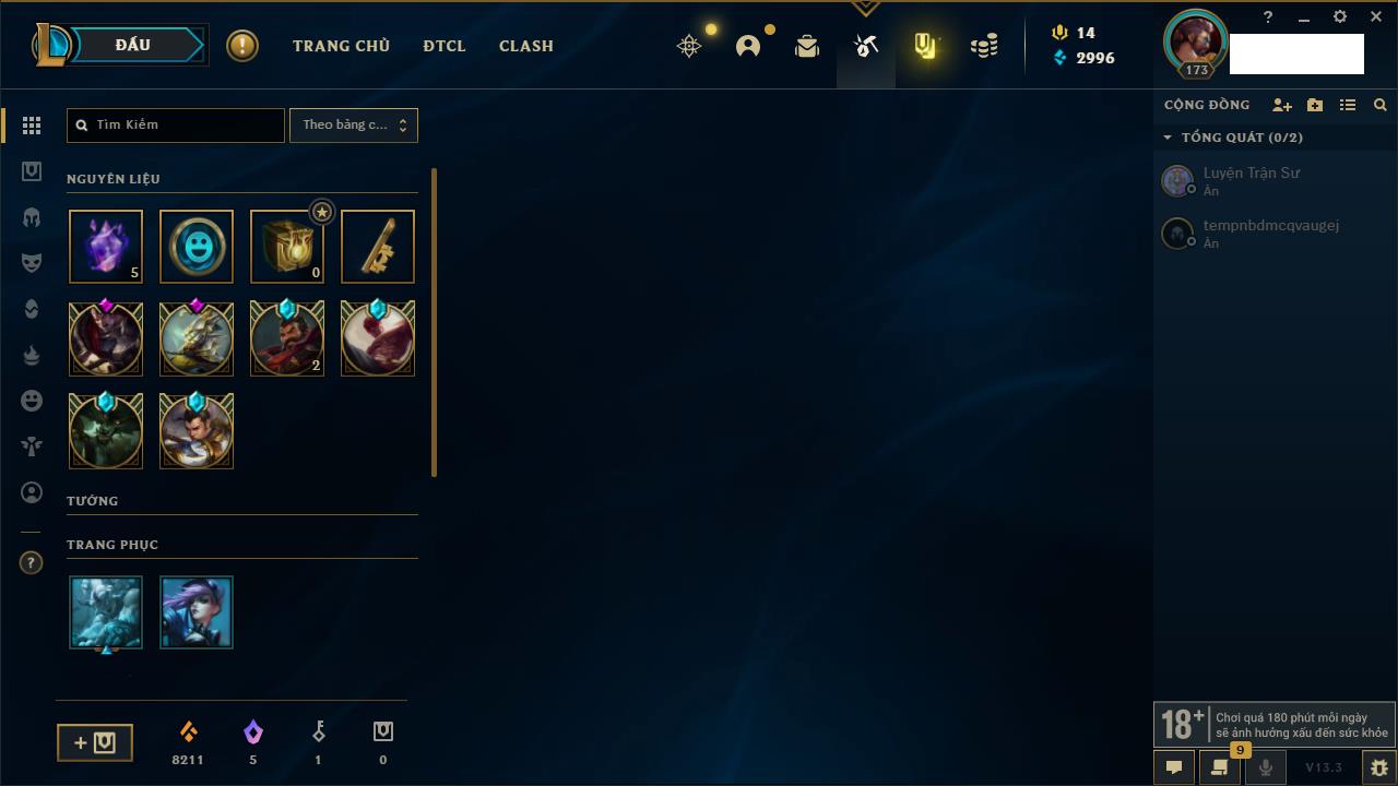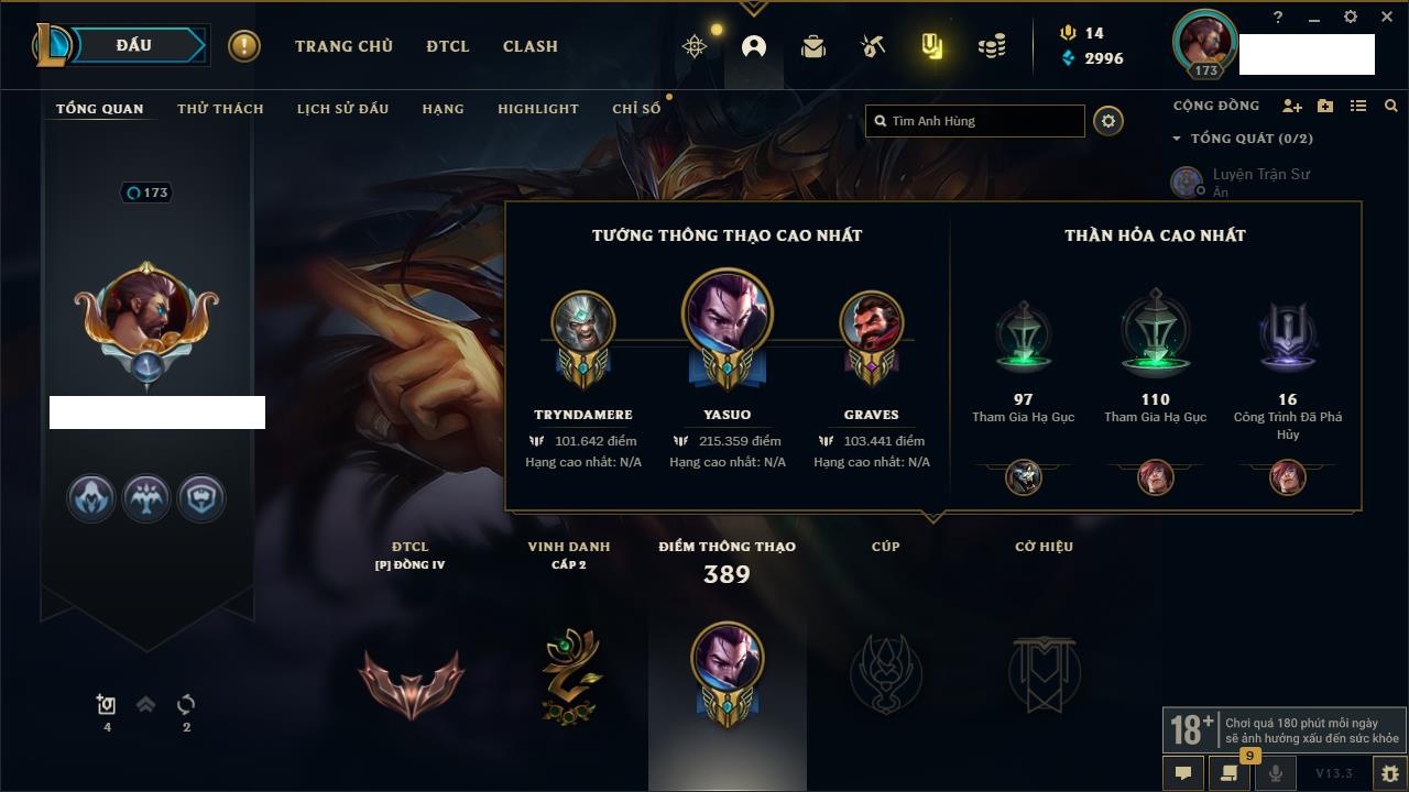 Rank Đơn: Chưa RankKhung: Chưa có khungTướng: 165 - Còn 3214 THXTrang Phục: 160Rank ĐTCL: Chưa RankLinh Thú: 28