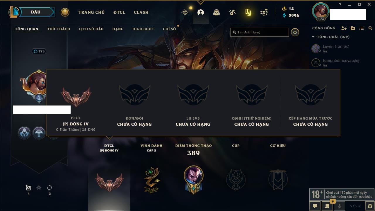 Rank Đơn: Chưa RankKhung: Chưa có khungTướng: 118 - Còn 13712 THXTrang Phục: 117Rank ĐTCL: Chưa RankLinh Thú: 34