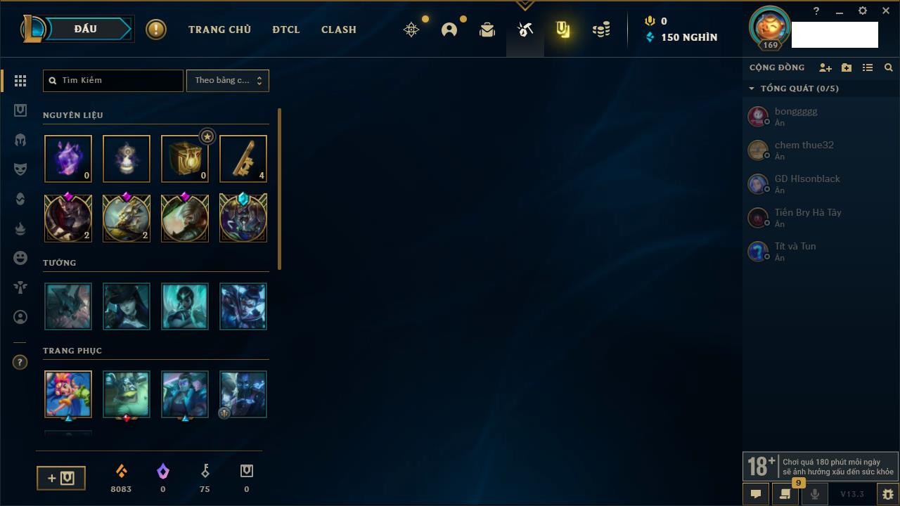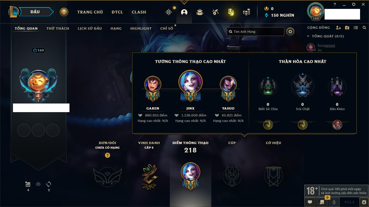 Rank Đơn: Vàng IVKhung: BạcTướng: 166 - Còn 180925 THXTrang Phục: 163Rank ĐTCL: Chưa RankLinh Thú: 67