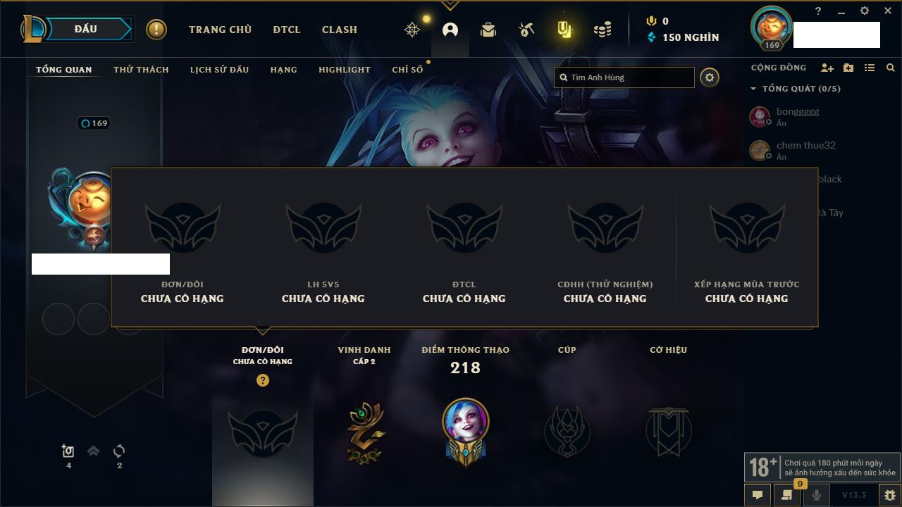Rank Đơn: Sắt IKhung: SắtTướng: 171 - Còn 125789 THXTrang Phục: 151Rank ĐTCL: Đồng IIILinh Thú: 72