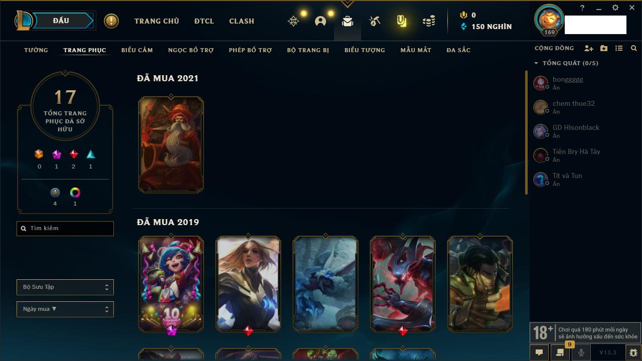 Rank Đơn: Vàng IVKhung: VàngTướng: 171 - Còn 48721 THXTrang Phục: 171Rank ĐTCL: Chưa RankLinh Thú: 27