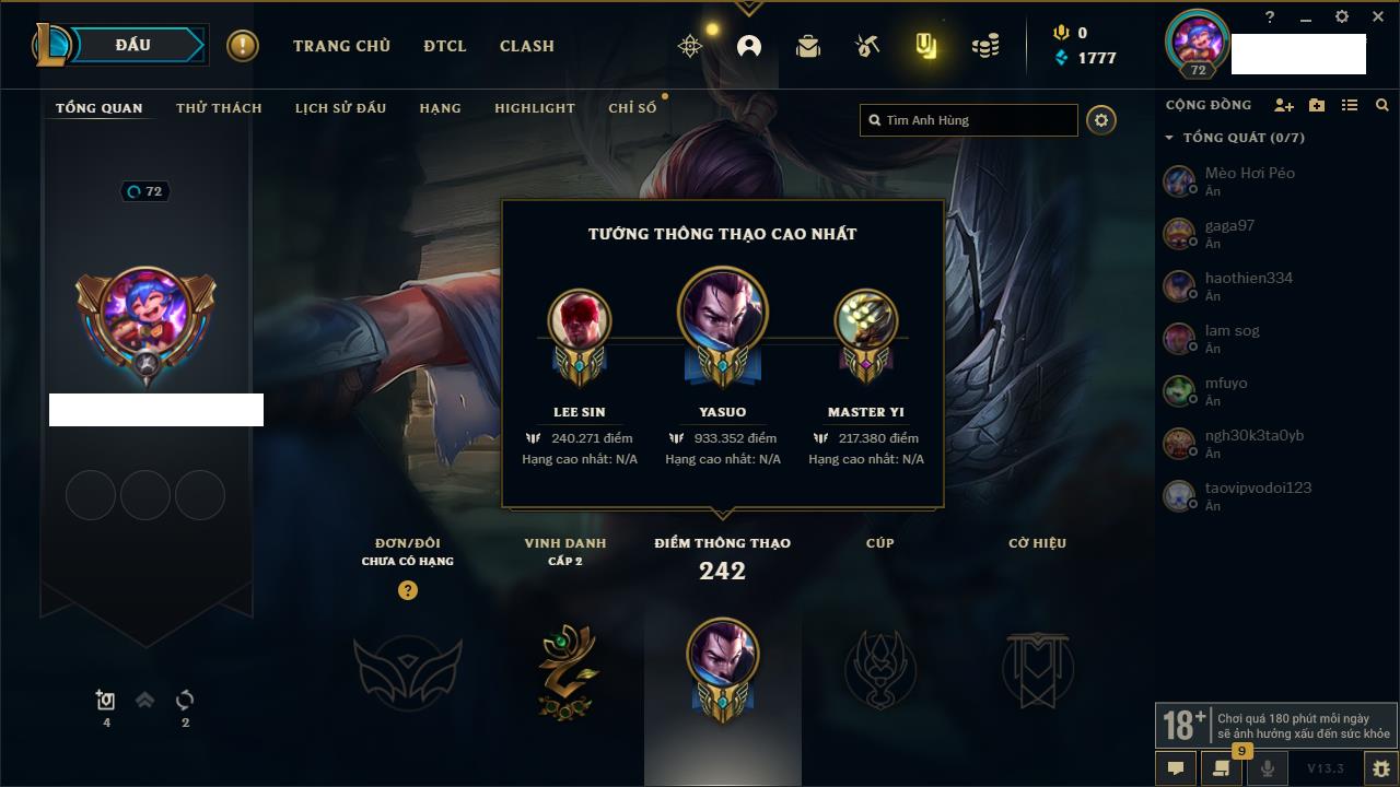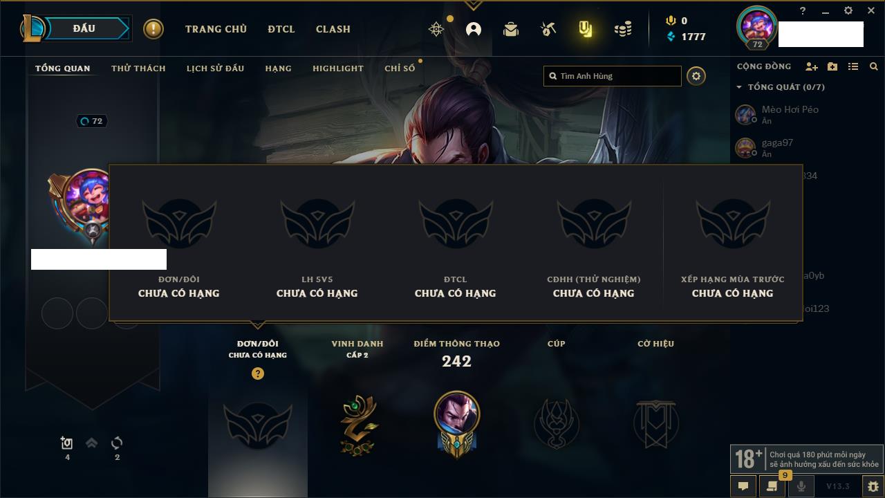 Rank Đơn: Bạc IVKhung: Chưa có khungTướng: 172 - Còn 38381 THXTrang Phục: 8Rank ĐTCL: Chưa RankLinh Thú: 63