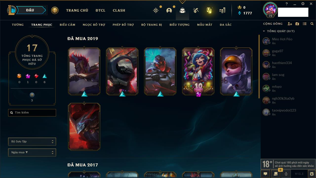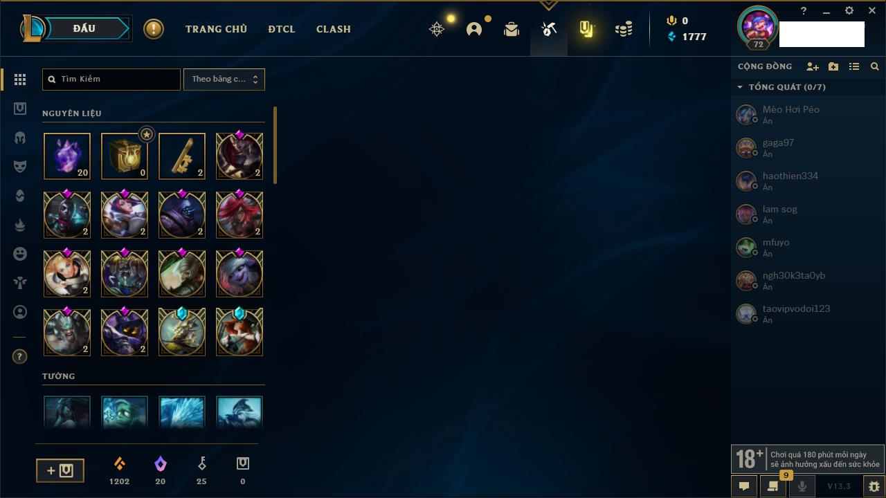 Rank Đơn: Chưa rank mùa nàoKhung: Chưa có khungTướng: 12 - Còn 3853 THXTrang Phục: 2Rank ĐTCL: Chưa RankLinh Thú: 30