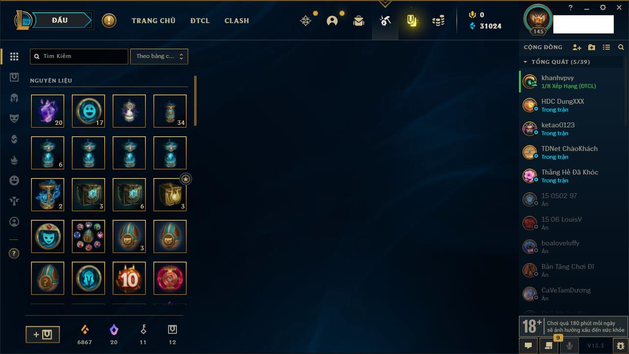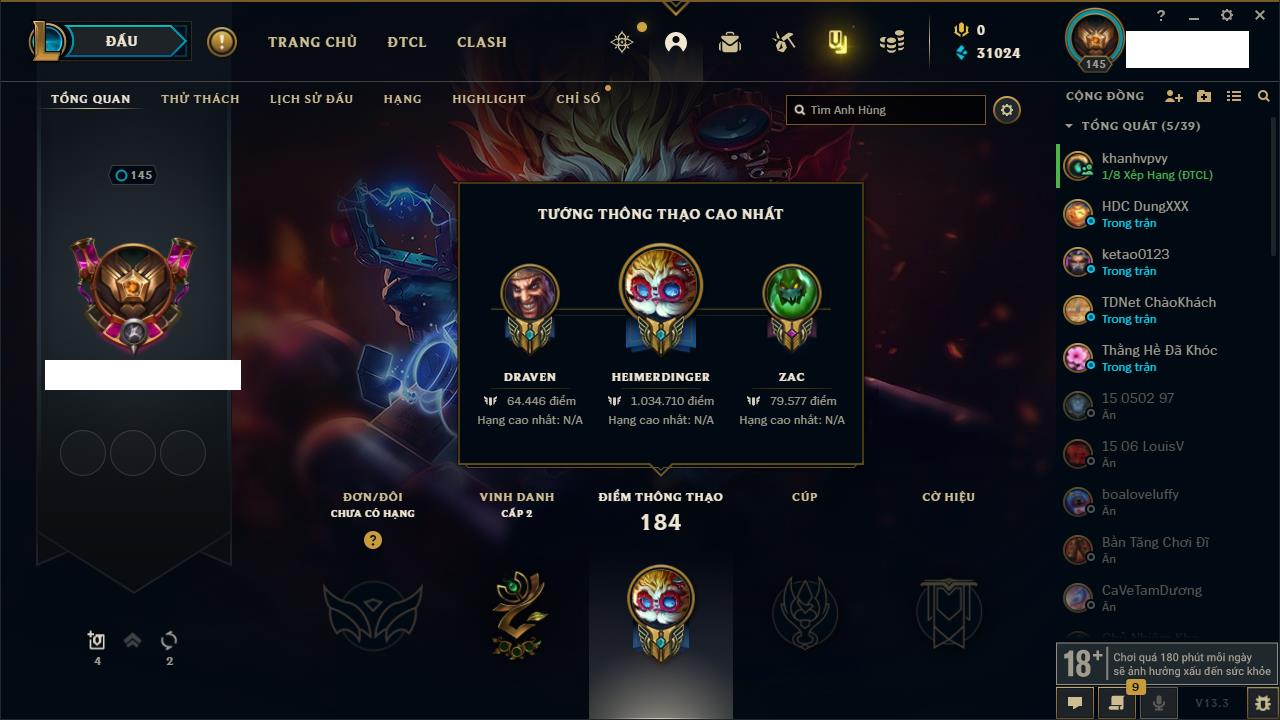 Rank Đơn: Vàng IVKhung: BạcTướng: 171 - Còn 231097 THXTrang Phục: 180Rank ĐTCL: Vàng IVLinh Thú: 110
