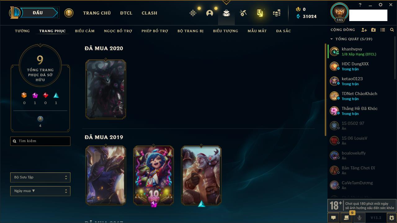 Rank Đơn: Vàng IVKhung: BạcTướng: 166 - Còn 180925 THXTrang Phục: 163Rank ĐTCL: Chưa RankLinh Thú: 67