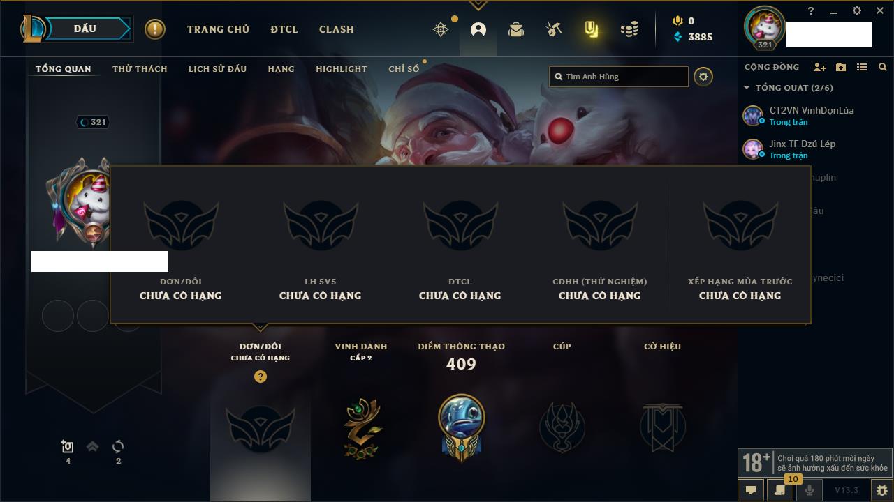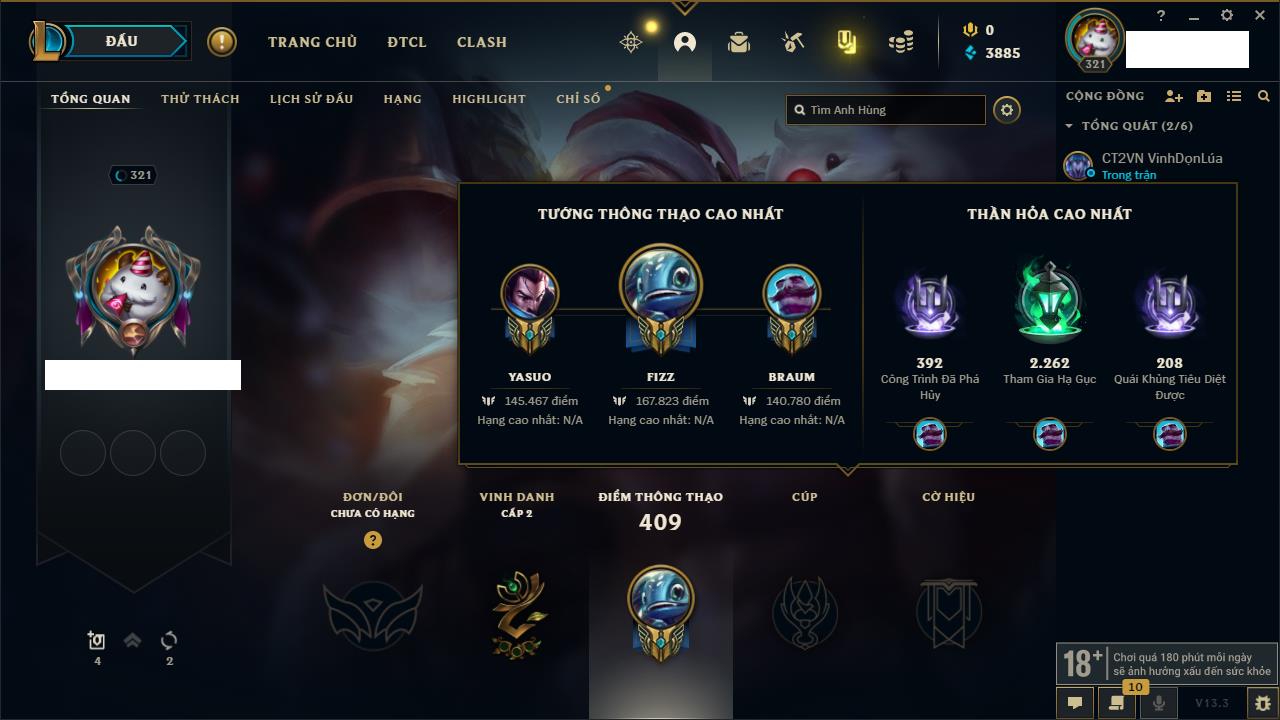 Rank Đơn: Chưa RankKhung: Chưa có khungTướng: 157 - Còn 6783 THXTrang Phục: 50Rank ĐTCL: Chưa RankLinh Thú: 37