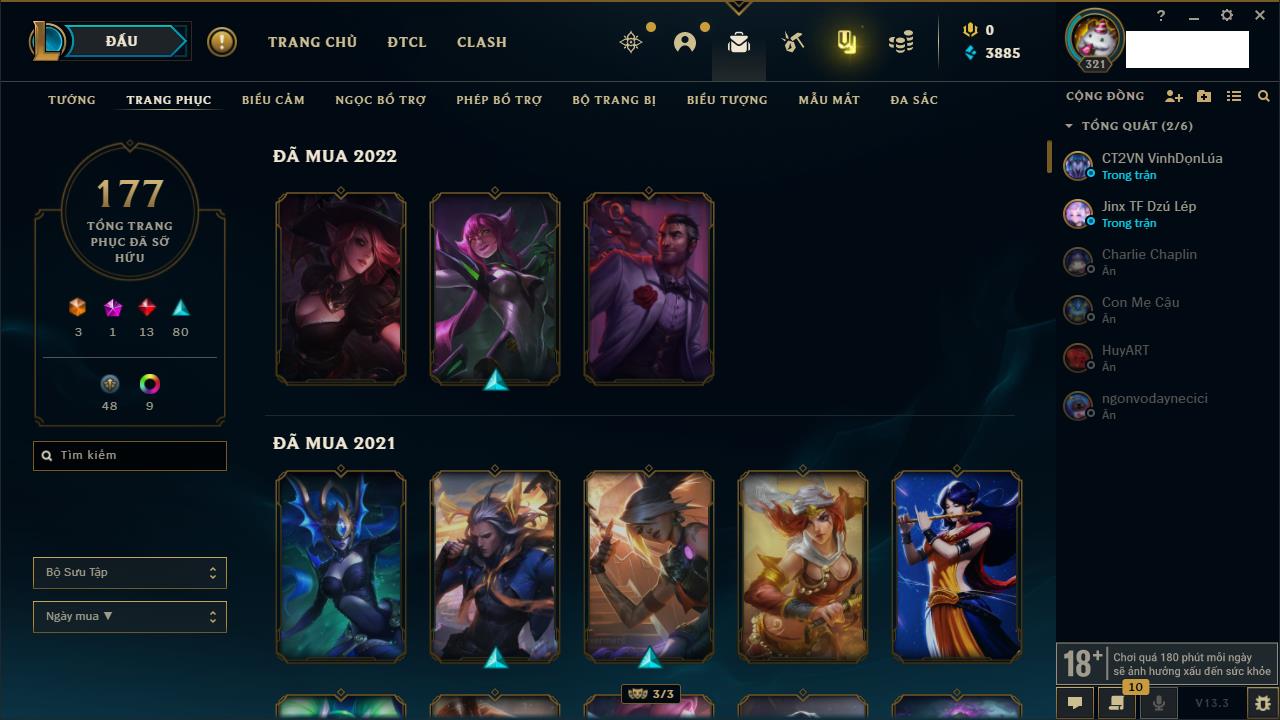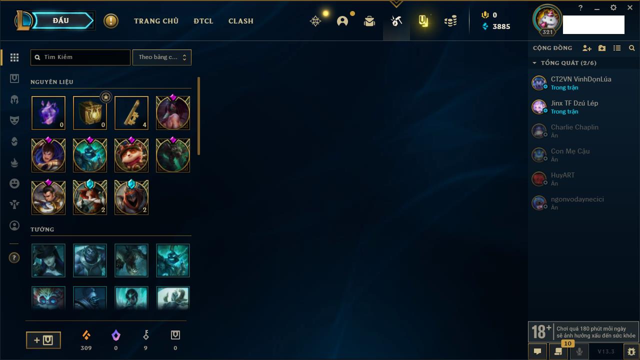 Rank Đơn: Vàng IIIKhung: VàngTướng: 170 - Còn 33222 THXTrang Phục: 136Rank ĐTCL: Chưa RankLinh Thú: 40