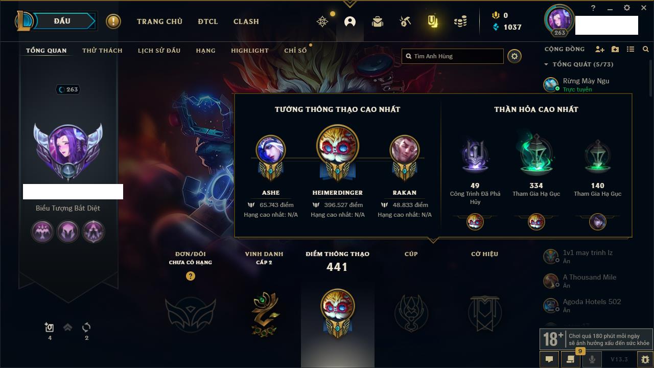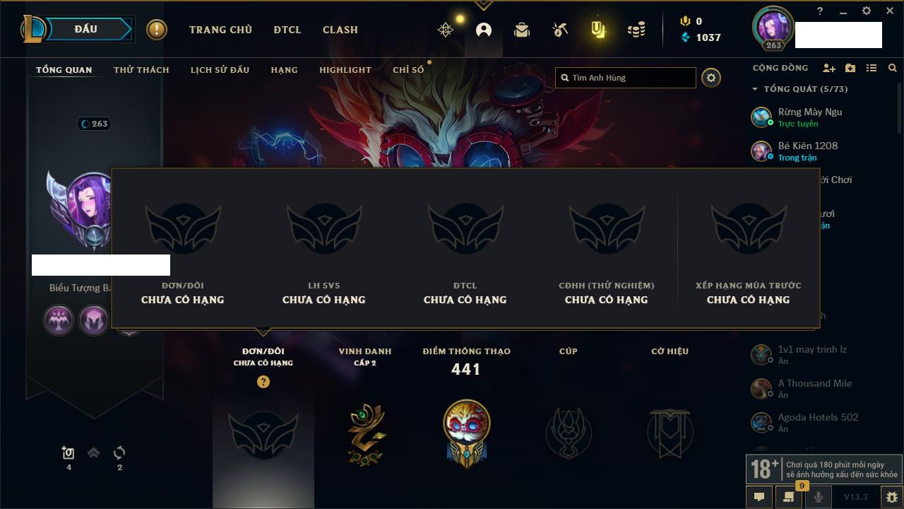 Rank Đơn: Chưa RankKhung: BạcTướng: 141 - Còn 299 THXTrang Phục: 101Rank ĐTCL: Chưa RankLinh Thú: 84