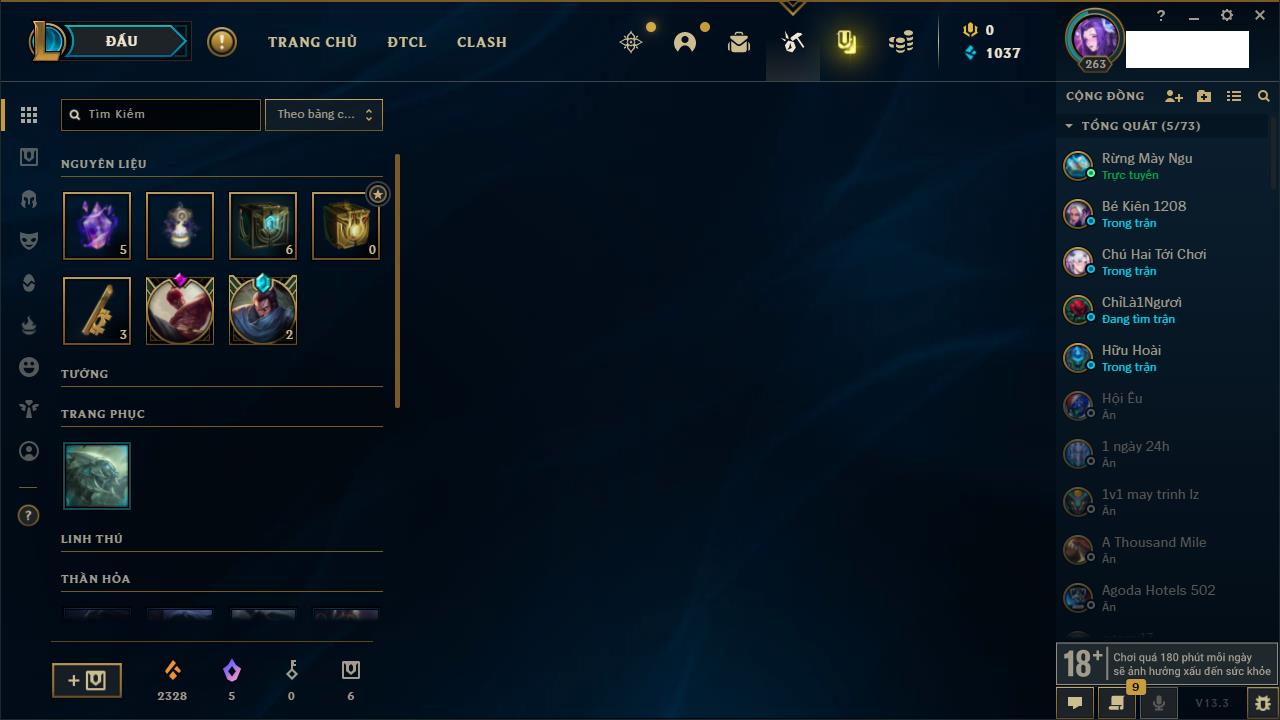 Rank Đơn: Chưa RankKhung: Chưa có khungTướng: 154 - Còn 18477 THXTrang Phục: 127Rank ĐTCL: Vàng ILinh Thú: 183