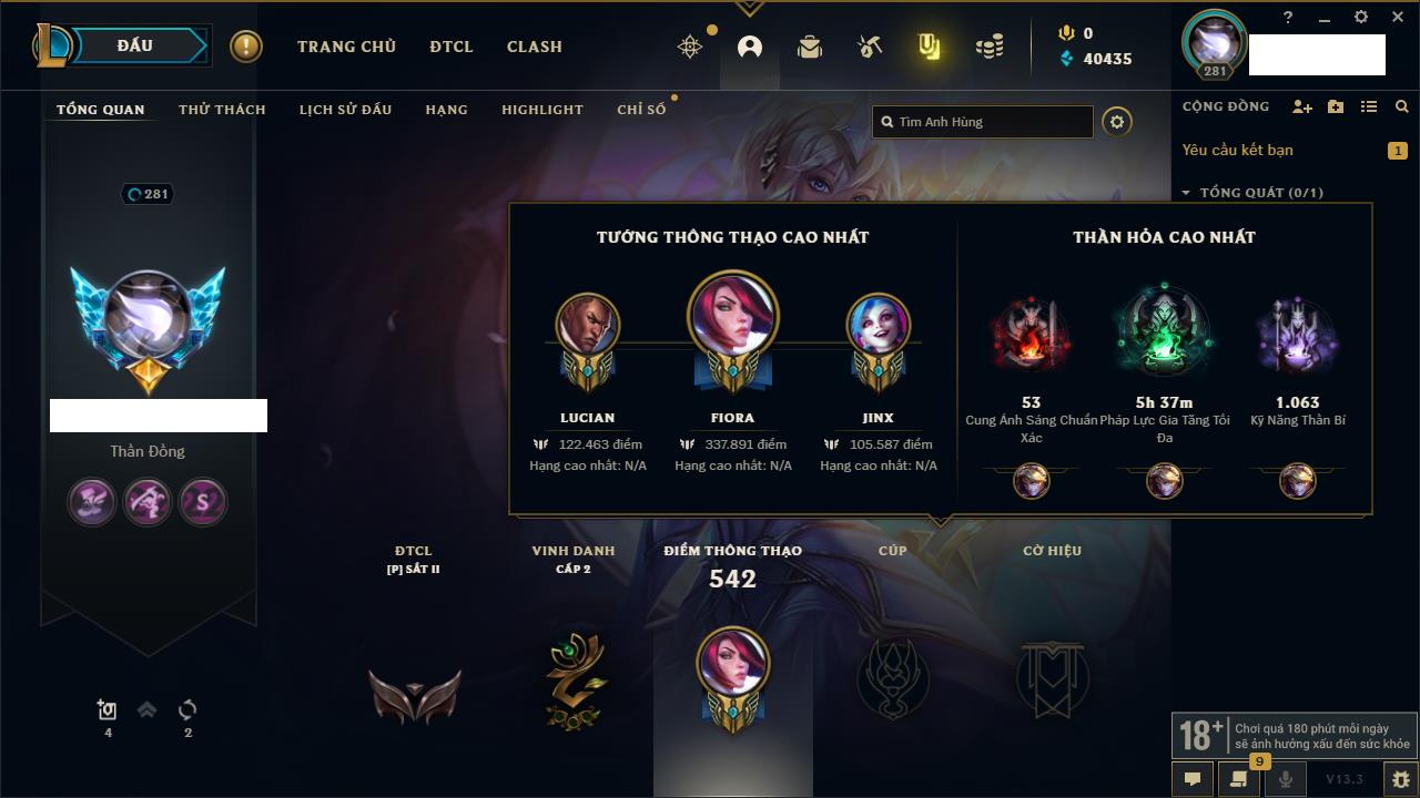 Rank Đơn: Sắt IKhung: SắtTướng: 38 - Còn 731 THXTrang Phục: 8Rank ĐTCL: Chưa RankLinh Thú: 72