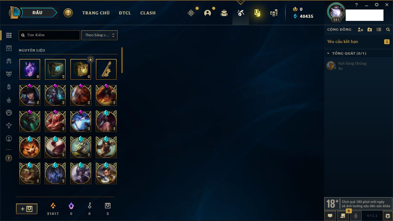 Rank Đơn: Chưa RankKhung: Chưa có khungTướng: 97 - Còn 1784 THXTrang Phục: 77Rank ĐTCL: Chưa RankLinh Thú: 72