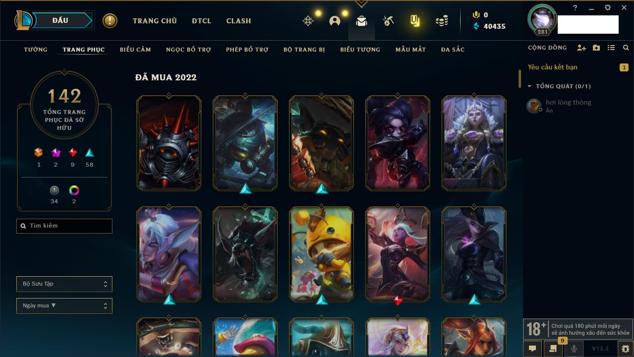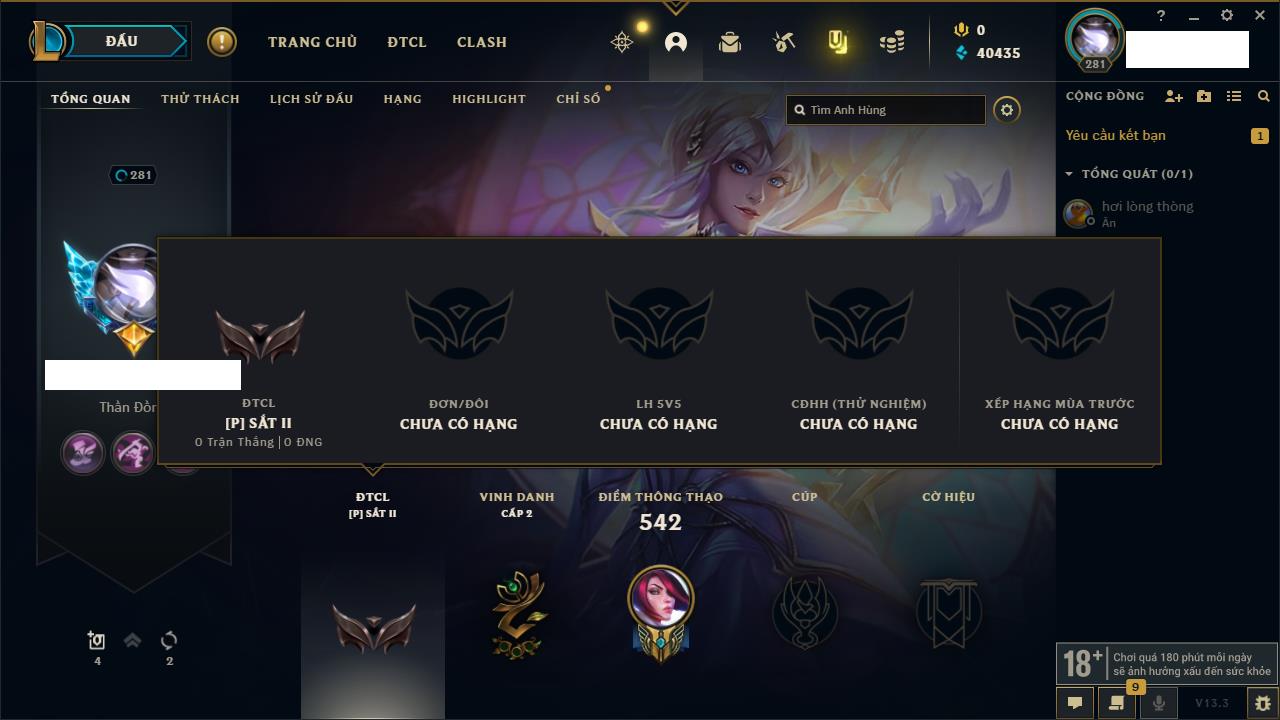 Rank Đơn: Chưa RankKhung: Chưa có khungTướng: 154 - Còn 18477 THXTrang Phục: 127Rank ĐTCL: Vàng ILinh Thú: 183