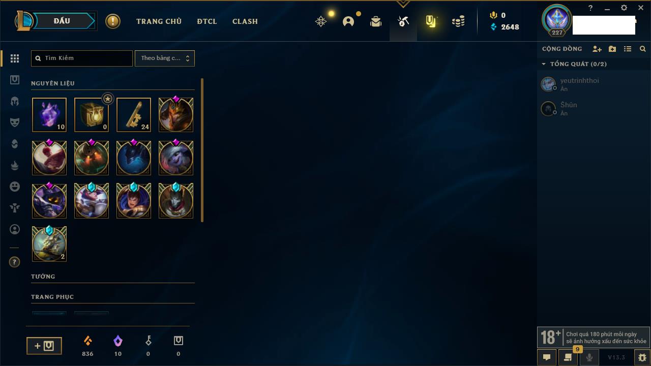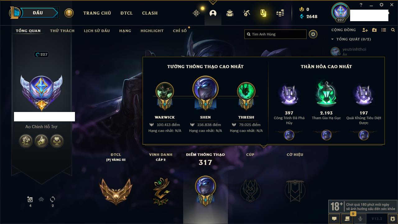 Rank Đơn: Chưa rank mùa nàoKhung: Chưa có khungTướng: 0 - Còn 2000 THXTrang Phục: 0Rank ĐTCL: Chưa RankLinh Thú: 14