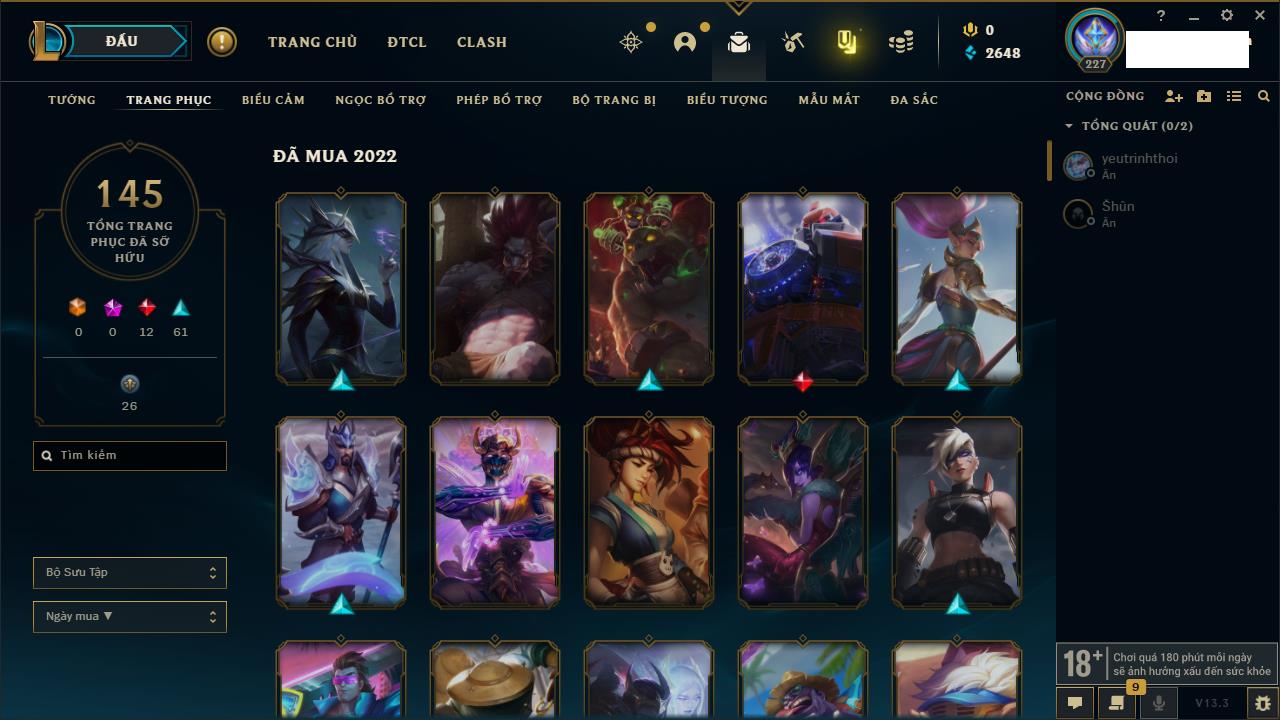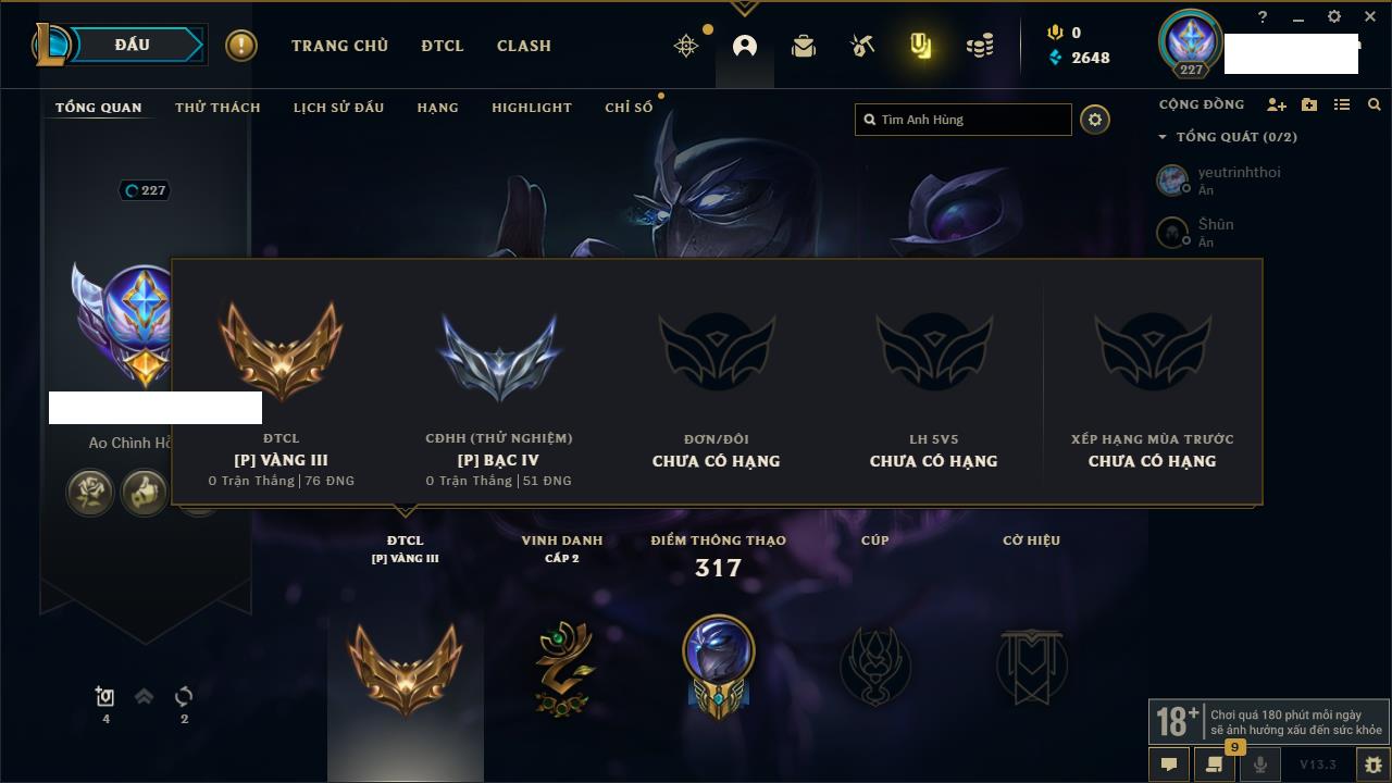 Rank Đơn: Chưa RankKhung: Chưa có khungTướng: 154 - Còn 18477 THXTrang Phục: 127Rank ĐTCL: Vàng ILinh Thú: 183