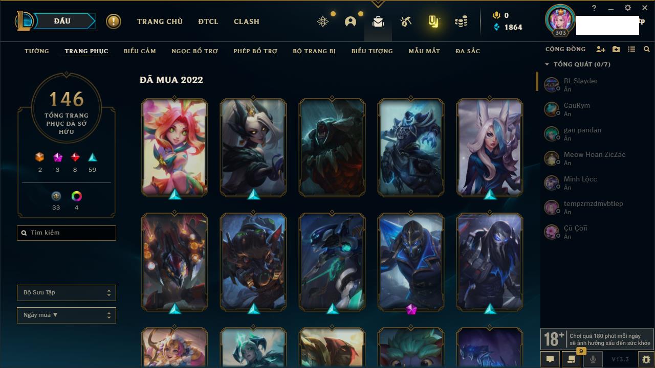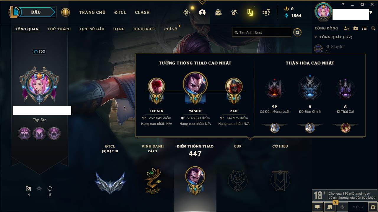 Rank Đơn: Chưa RankKhung: Chưa có khungTướng: 168 - Còn 10207 THXTrang Phục: 113Rank ĐTCL: Chưa RankLinh Thú: 103